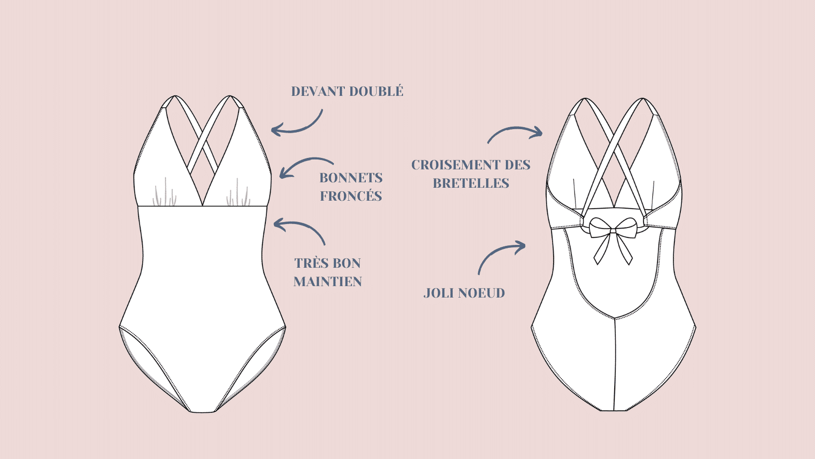 L’échancrure dans le dos est mise en valeur grâce au jeu de croisement des bretelles. Ces liens sont pensés pour s’adapter à différentes morphologies et permettre un ajustement optimal lors de l’essayage (sans ajustement couture particulier). Les bretelles ont pour vocation à se porter croisé dans le dos mais la version sans croisement est possible pour varier les styles et le bronzage.
