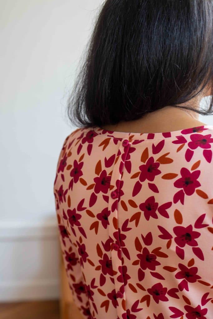 En effet, il n’est pas aisé de réaliser des boutonnières ou des fronces sur du jersey. C’est pourquoi nous avons pensé à une fausse patte de boutonnage qui vous surprendra par sa facilité (une seule couture suffit, vous y croyez ?). De même pour l’option basque et pour les volants des manches, nous étions inquiètes à l’idée que des fronces classiques ne déforment le tissu et que le rendu ne soit pas très esthétique. Nous avons donc choisi une autre méthode afin de réaliser les fronces avec du framilastic. Après quelques essais, nous étions enthousiasmées par le résultat !
