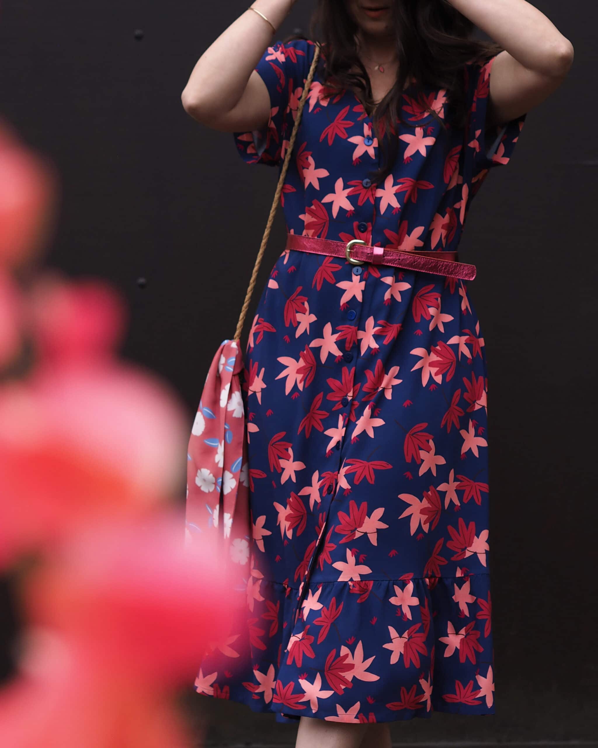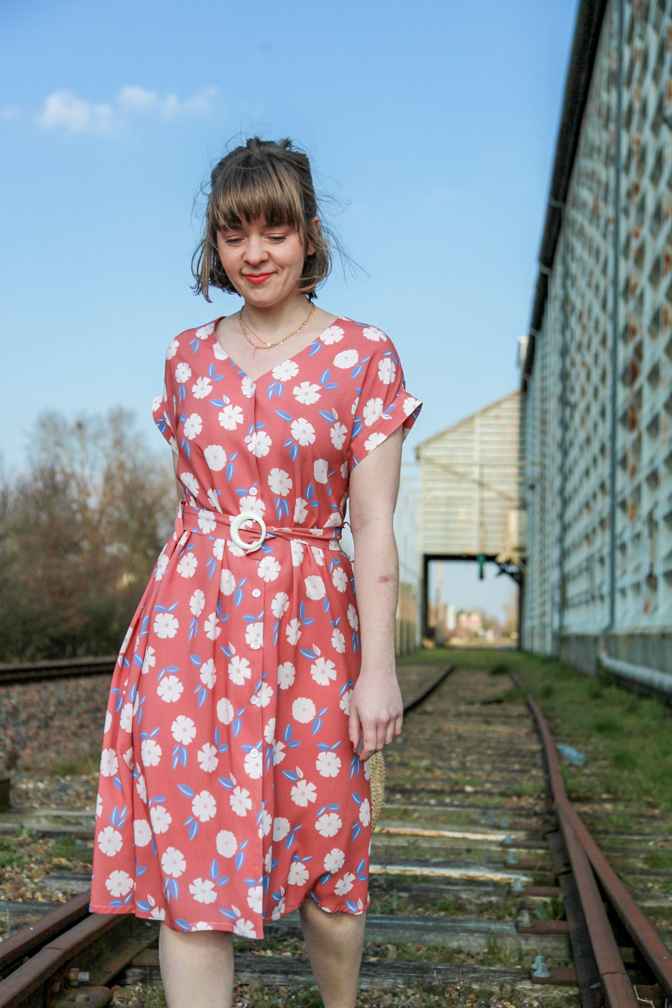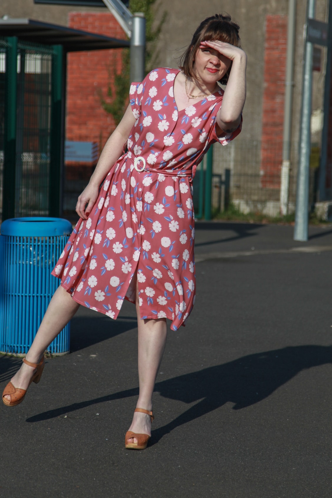 Très agréablement surprise par la tenue de cette viscose, qui ne bouge pas sous les ciseaux et le pied de biche ! J’ai été charmée par ces couleurs douces et ce motif fleuri qui a une délicieuse touche rétro! J’y est tout de suite imaginé la parfaite robe printanière qui n’a rien à envier aux collections de prêt à porter ! «