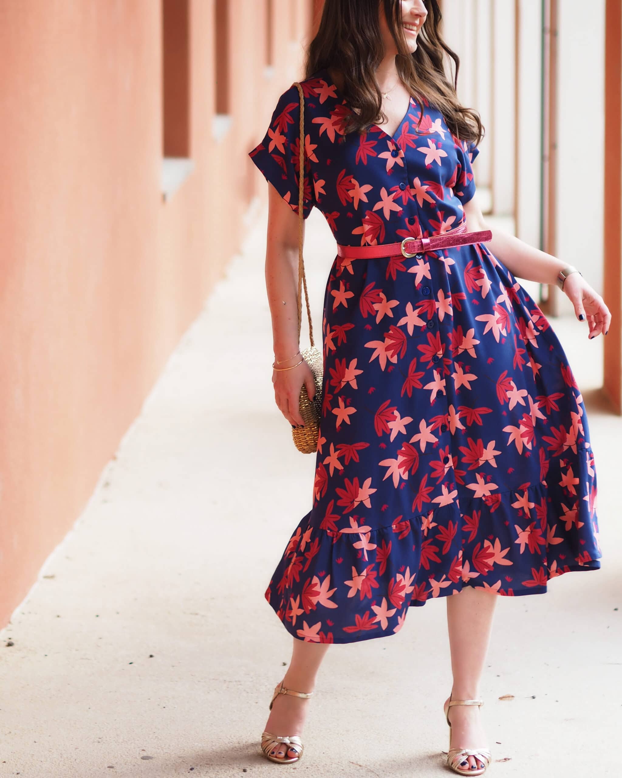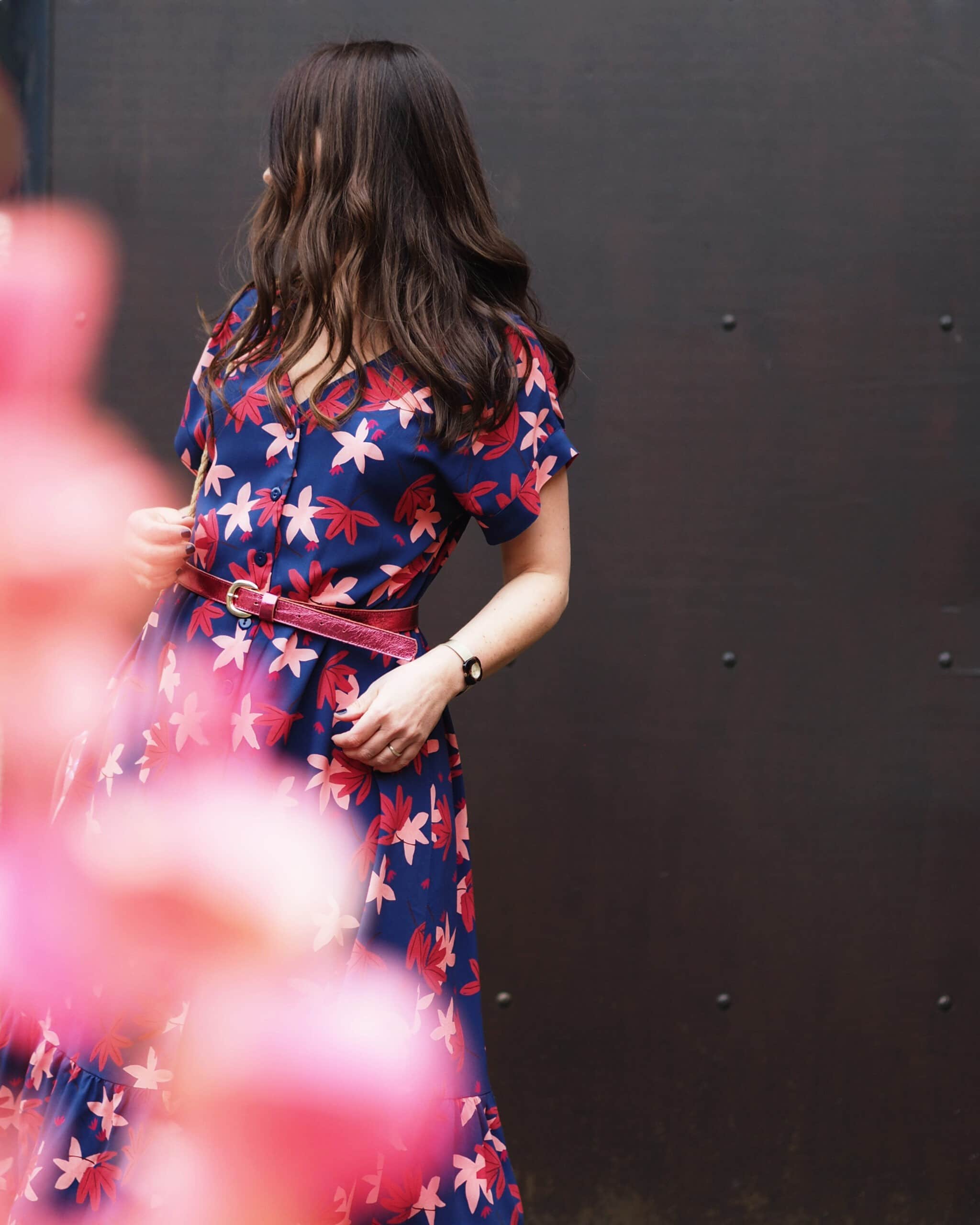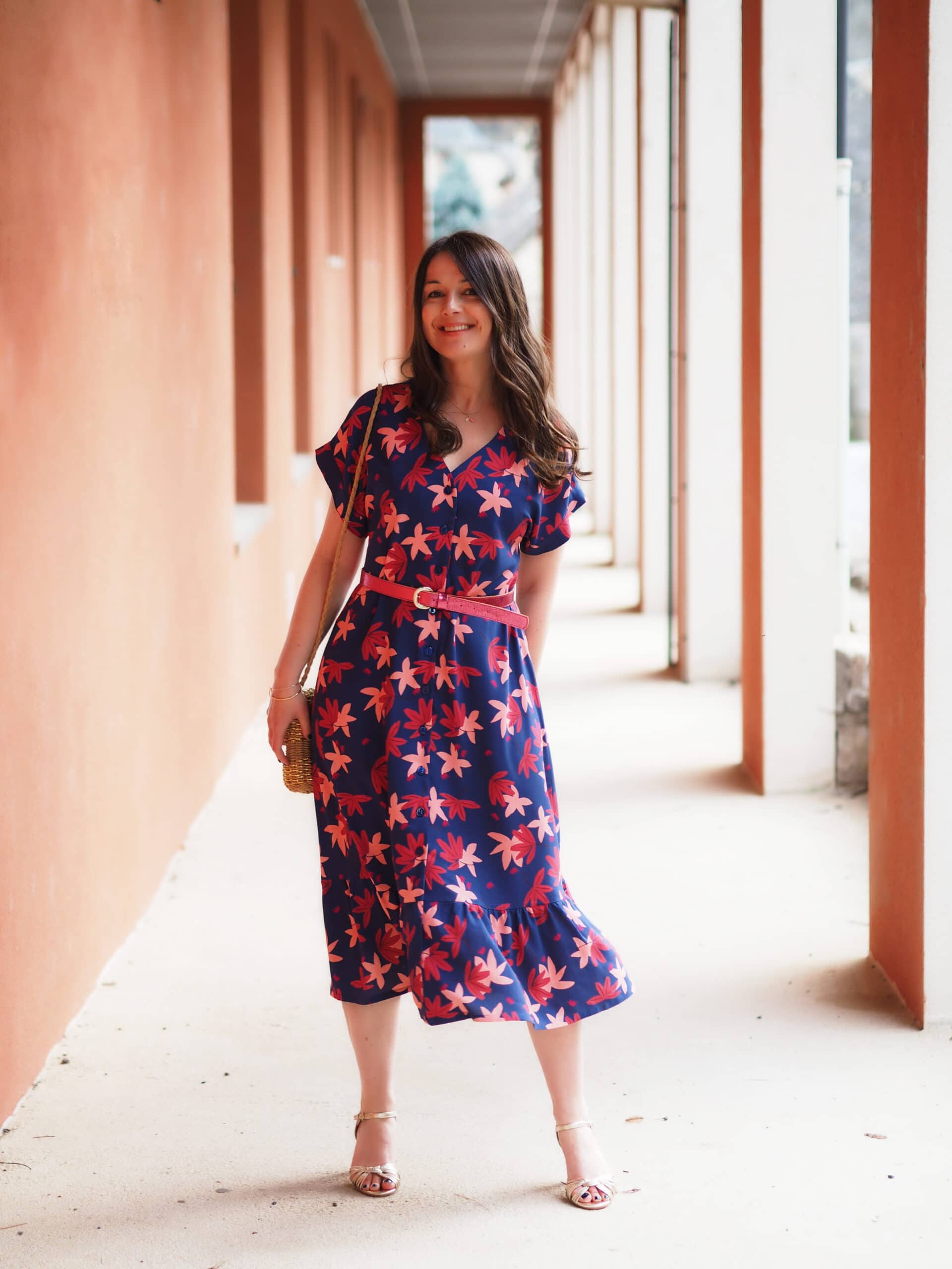 Très agréablement surprise par la tenue de cette viscose, qui ne bouge pas sous les ciseaux et le pied de biche ! J’ai été charmée par ces couleurs douces et ce motif fleuri qui a une délicieuse touche rétro! J’y est tout de suite imaginé la parfaite robe printanière qui n’a rien à envier aux collections de prêt à porter ! «