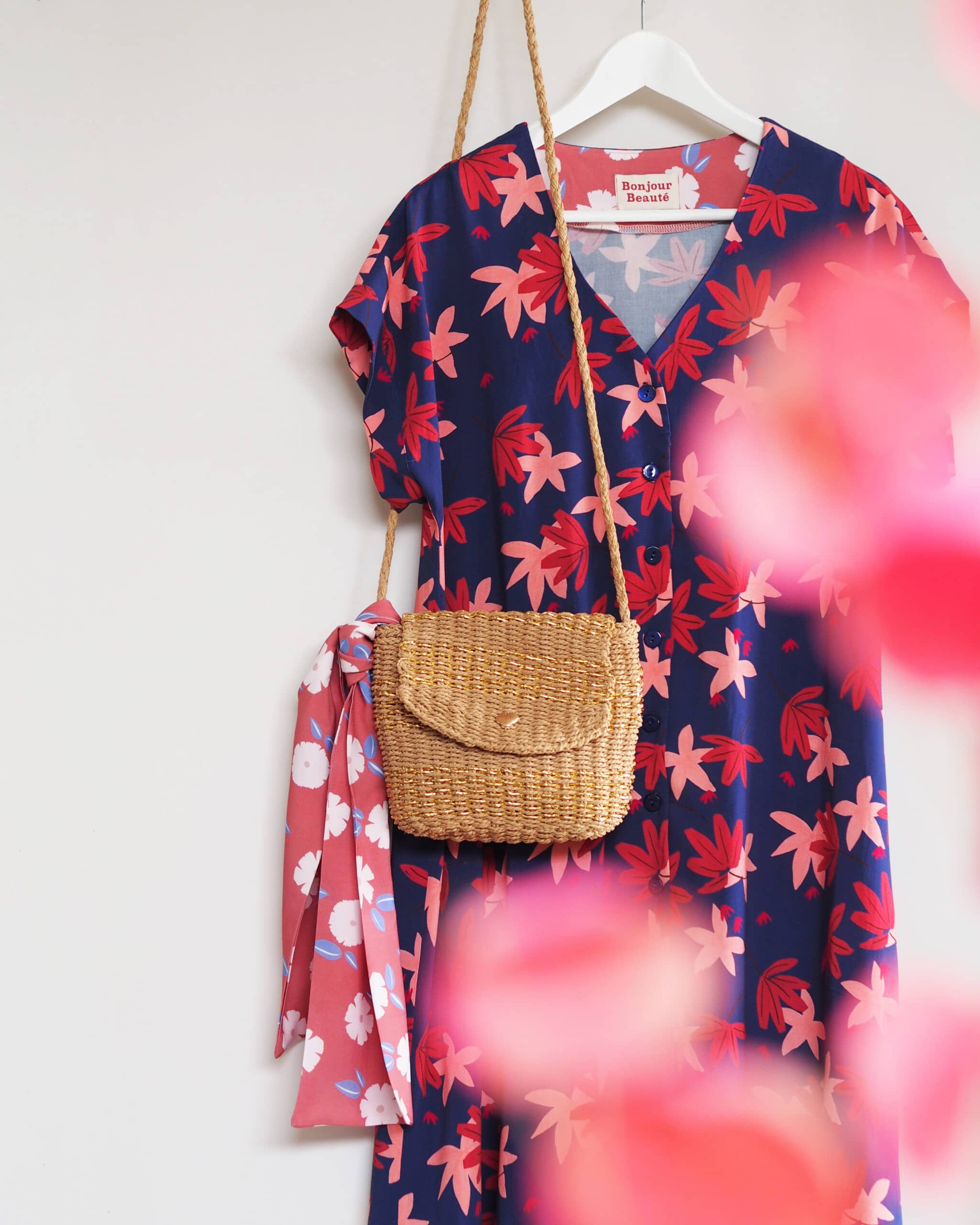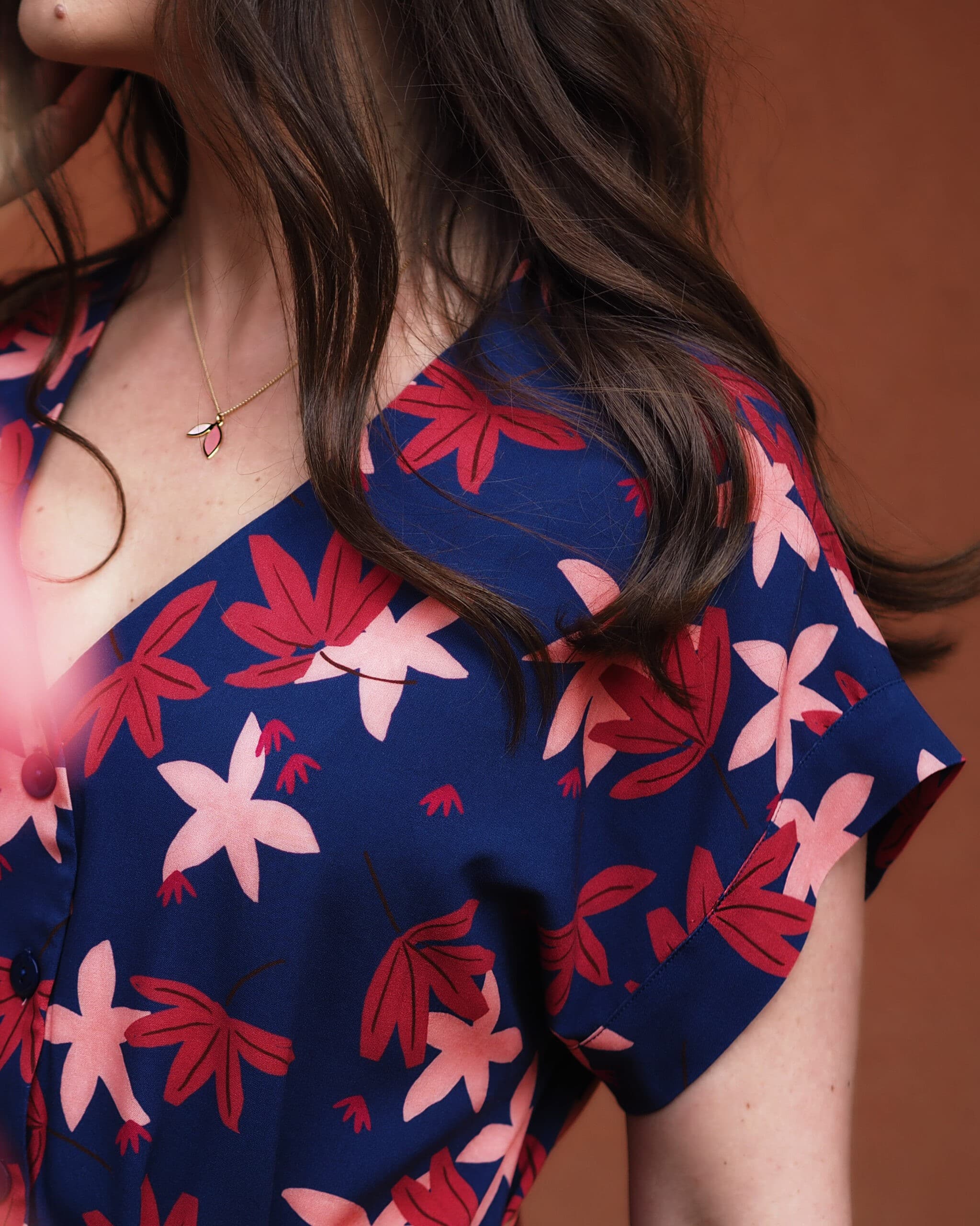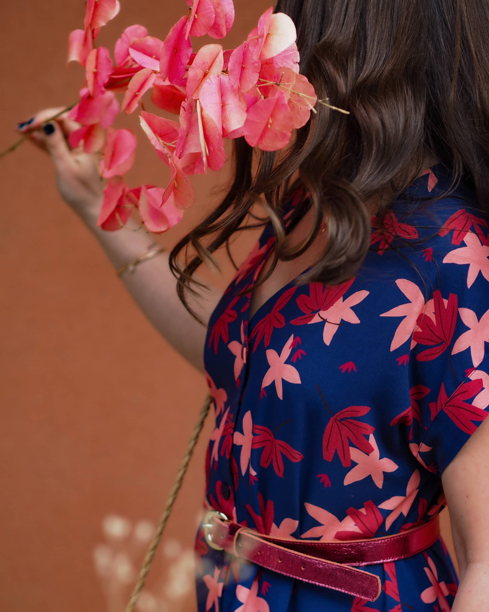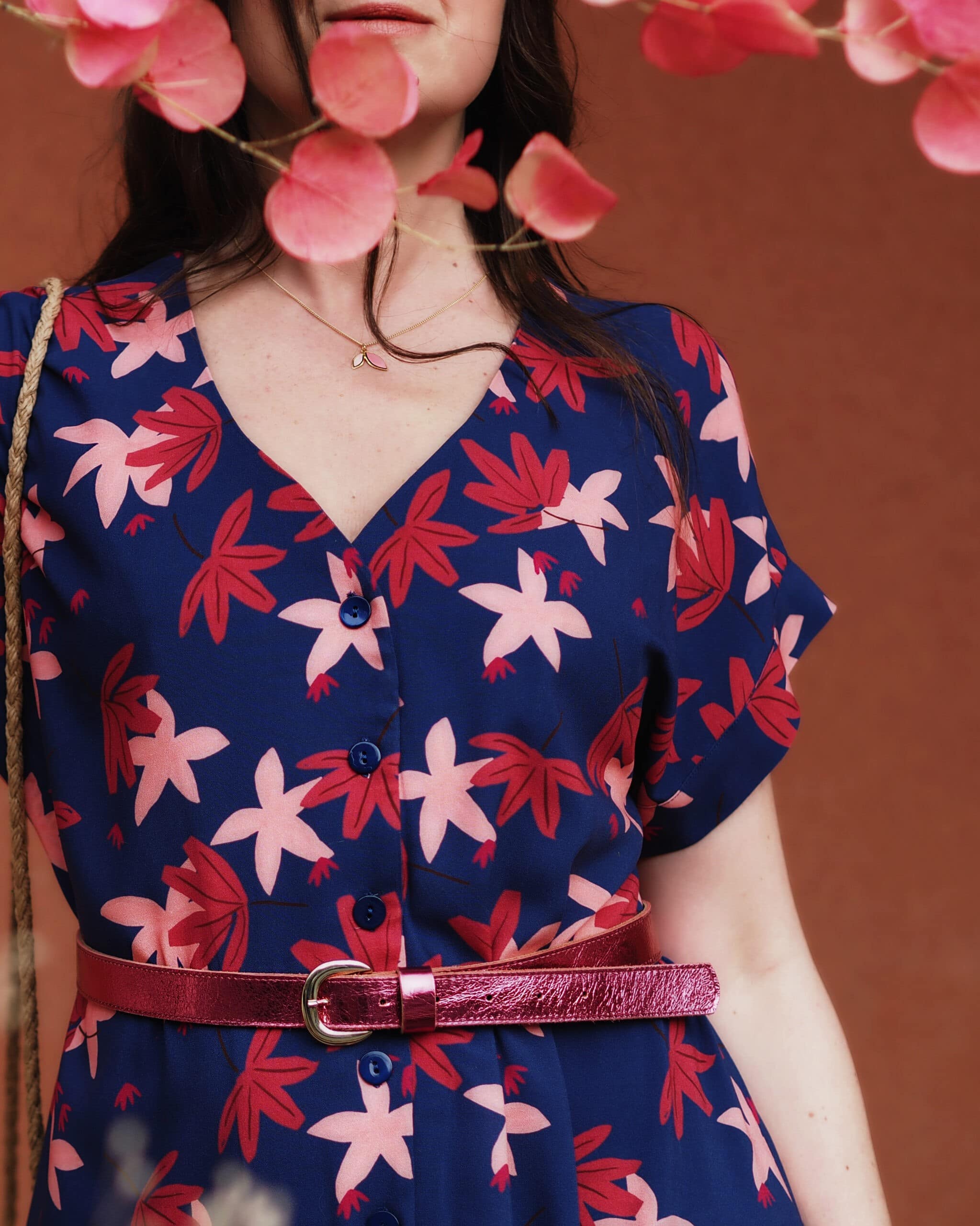 Ensuite, comme j’aimais beaucoup le fond bleu marine du motif, je me suis dit qu’il fallait aussi travailler là-dessus et restituer en parallèle une ambiance un peu plus tamisée de soir d’été, avec pour fil conducteur, toujours, les feuillages roses au premier plan. Ce parti-pris m’a permis de découvrir que le motif pouvait rappeler aussi comme des étoiles roses dans la nuit, une atmosphère plus onirique. D’ailleurs rappelée par le joli bleu des boutons glossy assortis.