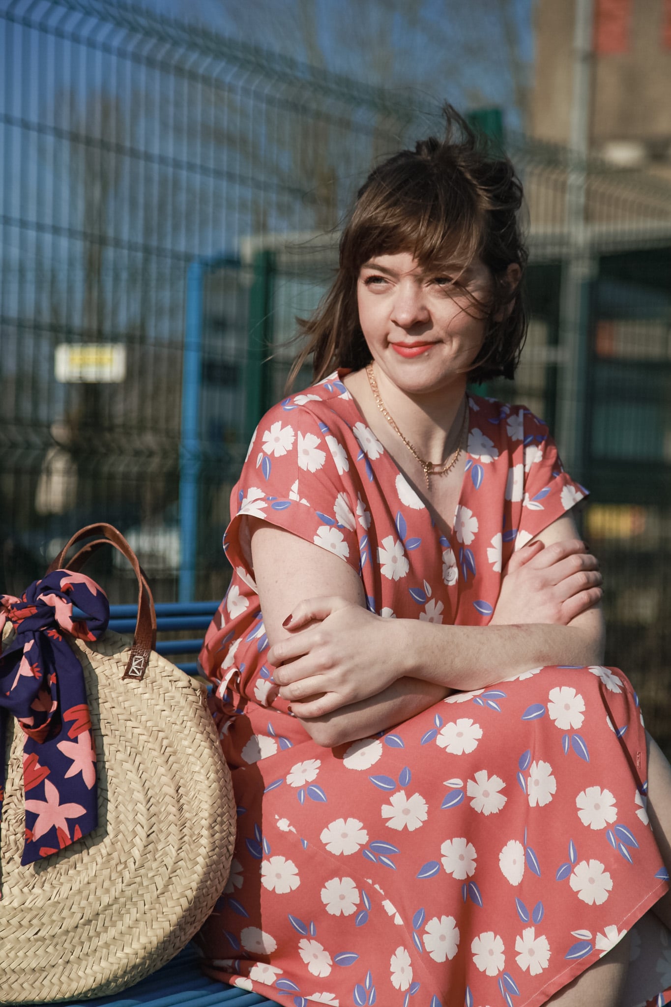 Et enfin, dans le cadre de mon duo avec Emilie, j’ai cousu la parementure dos de ma robe dans le Rosée Printanière et j’ai accessoirisé ma tenue d’un petit foulard toujours dans le tissu de la robe d’Emilie. Nous avons beaucoup échangé et préparé avec un immense plaisir ce travail en binôme, en nous inspirant aussi de la marque Des Petits Hauts.«