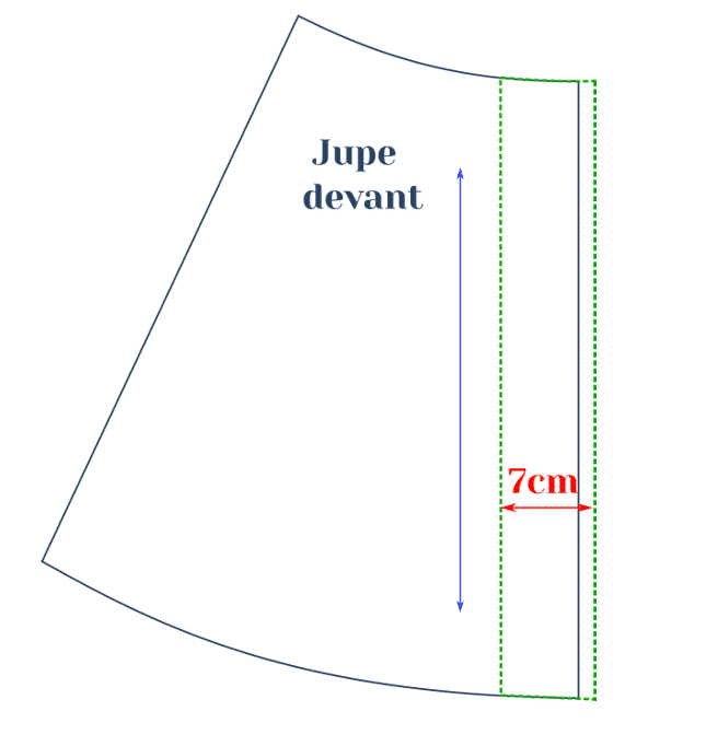 Sur cette même pièce, tracez ensuite l’empreinte de la patte de boutonnage. Celle-ci mesure 7cm au total, valeurs de couture comprises (en vert sur le schéma).