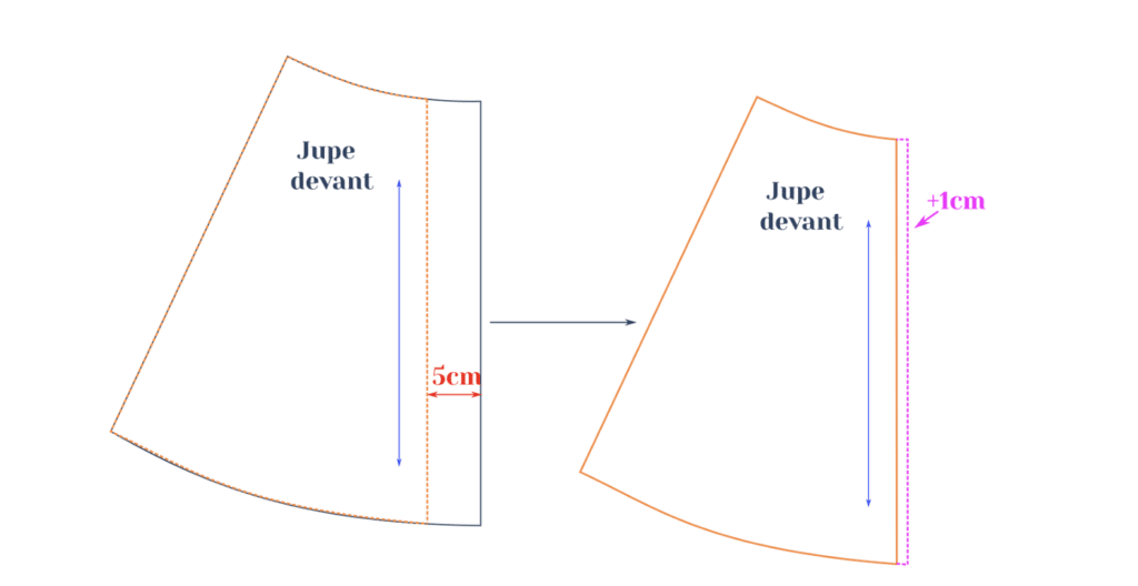 La doublure devant correspond à la jupe devant, moins la largeur de la patte de boutonnage. Pour créer la doublure, nous allons utiliser la pièce de la jupe devant allongée.