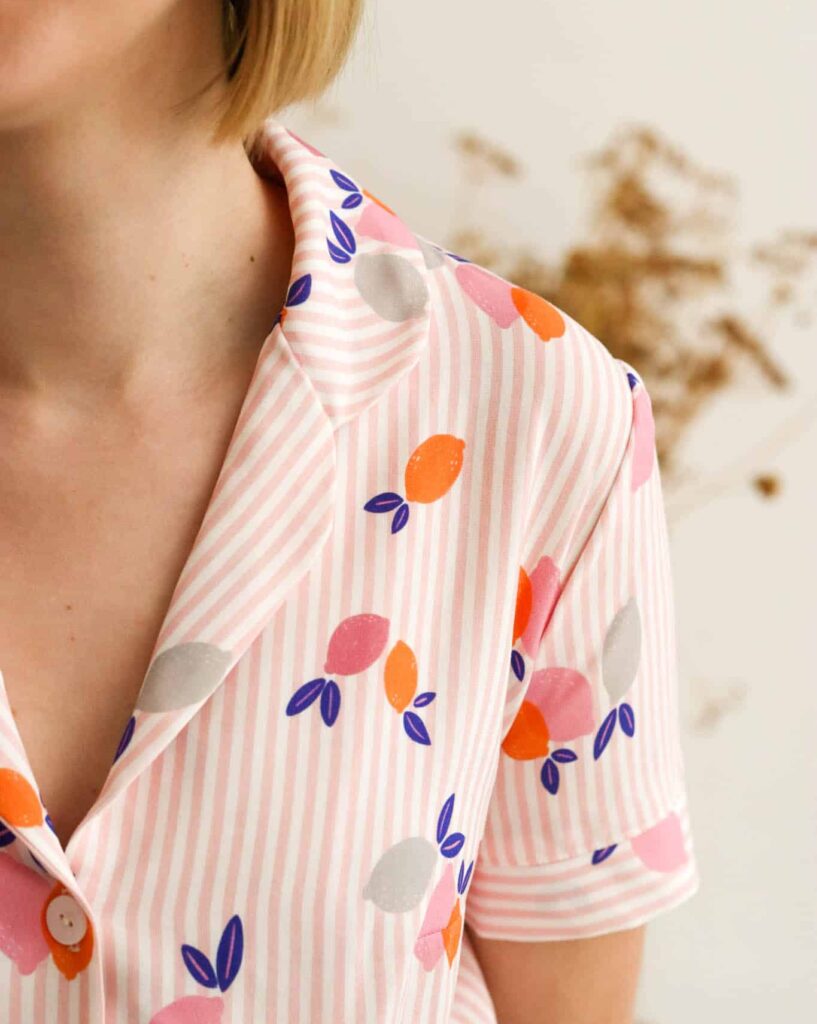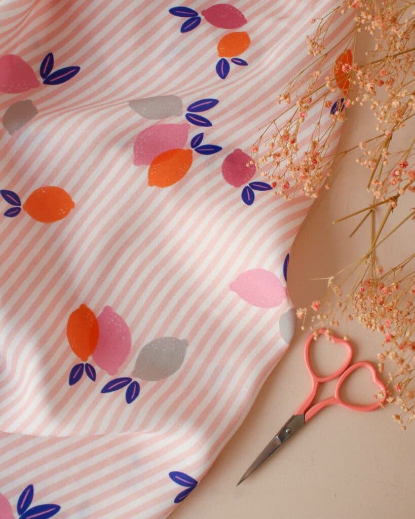 Limonade est le motif de l’été par excellence. Ses petits citrons nous envoient directement sous le soleil de la Méditerranée où il fait bon prendre une limonade à l’ombre des pins. Une pause rafraichissante par de fortes chaleurs qu’on apprécie revêtue de sa plus jolie tenue de vacances. Des rayures rose pastel viennent apporter du caractère à ce motif et offrent un fond romantique aux citrons qui se parent de couleurs à la fois pleines de vitalité et de douceur.  Nous retrouvons des couleurs peps comme l’orange et le corail qui viennent s’adoucir au contact des citrons gris et vieux rose. Ce motif s’équilibre avec les feuilles bleue électrique.