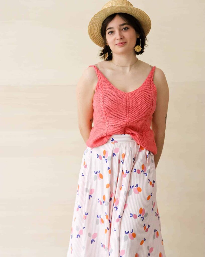 Ci-dessous Meije porte une jupe Feuillette (patron Cousette) avec notre top Suzanne, Lise D porte une chemise Juliette (patron République du chiffon) et Lise P porte une robe à partir d’un hack de la nuisette de notre livre Cozy at home.
