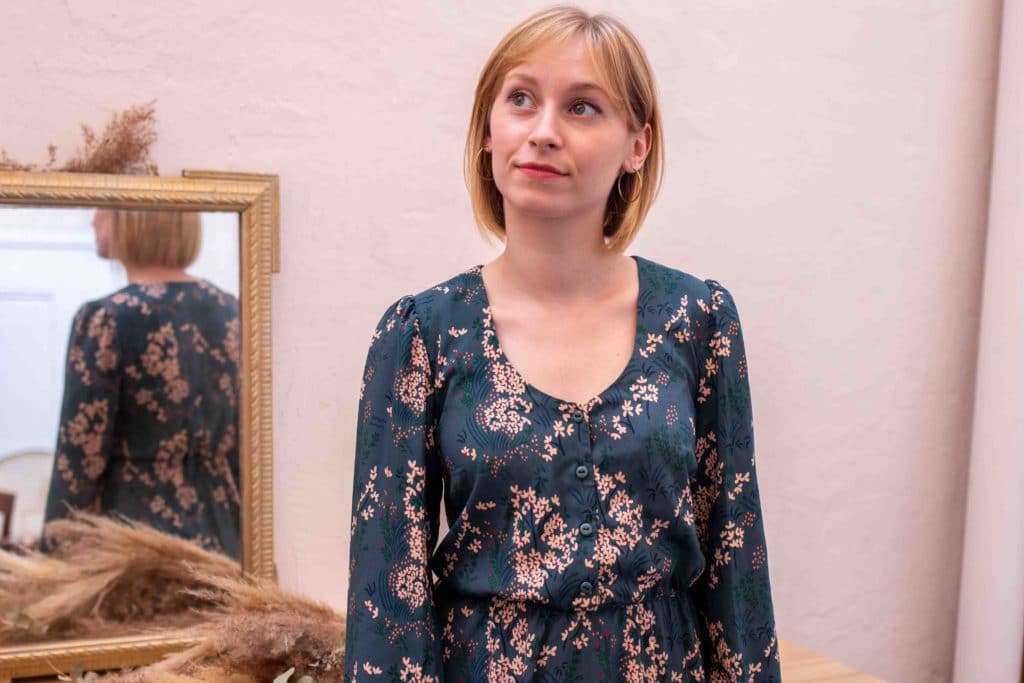 If you have followed our saga on the birth of the Comete fabric, you will remember that another fabric was initially planned for our Comète dress pattern. It was our Olympe fabric from the winter collection. This pretty green fabric with a hint of red in the middle of pretty cream flowers goes so well with a collarless version of our comete dress.
