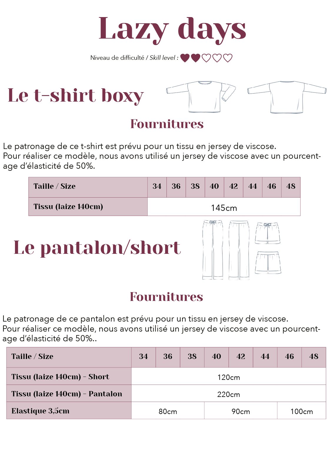 With Lazy Days , we present viscose jersey. As comfortable as cotton jersey, viscose gives it a completely different drape. Fluid and heavy, yet still very comfortable and stretchy, it's a slightly more difficult fabric to handle.