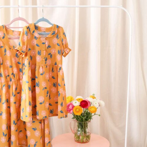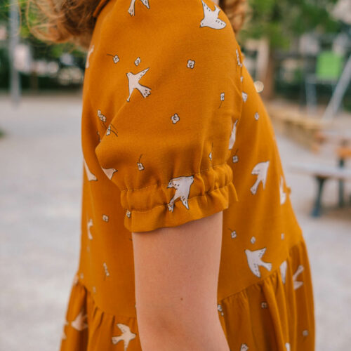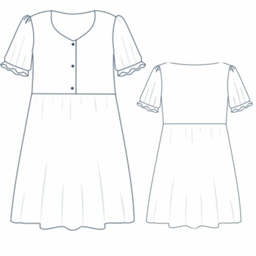 To sew this dress, fluid fabrics are recommended: viscose, crepe, silk, satin cotton… The pattern has been drafted for woven fabrics.