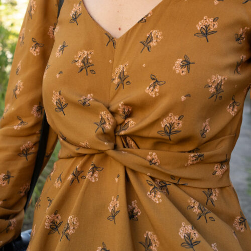 Solstice is an elegant looking dress. Featuring a pretty V-neckline, a drape tied on the front of the bust enhances the waistline. The gathers at the back give ease to this tailored dress closed by an invisible zipper. Solstice can also be sewn as a blouse and offers two sleeve options: Butterfly sleeves to bring lightness or slightly puffy sleeves finished with a cuff.