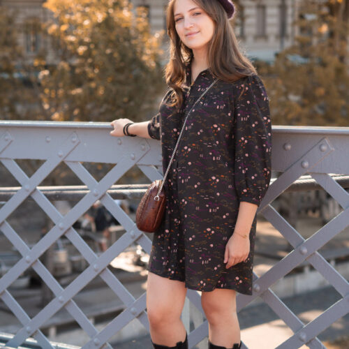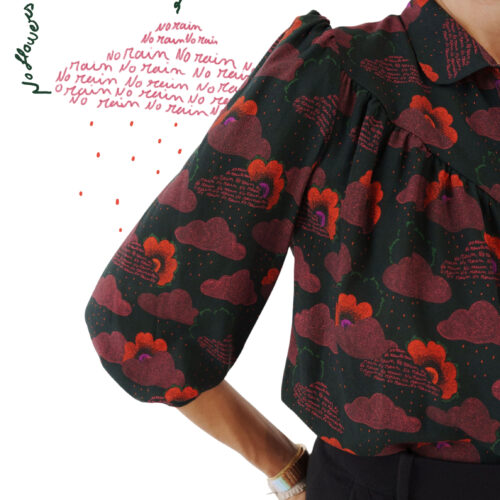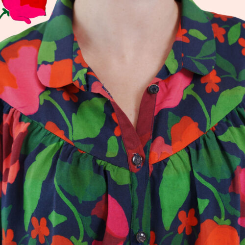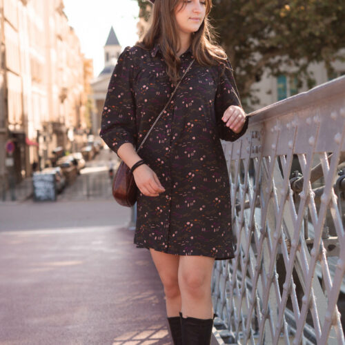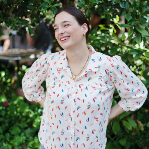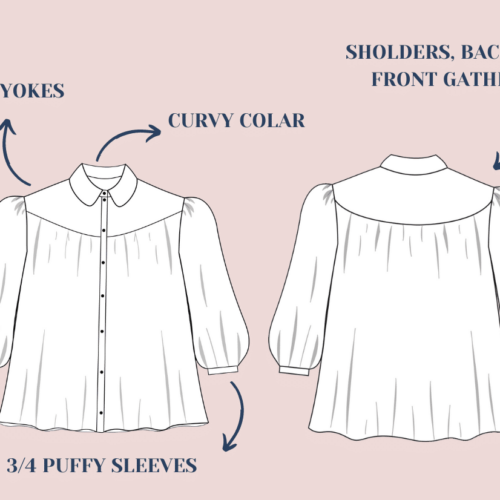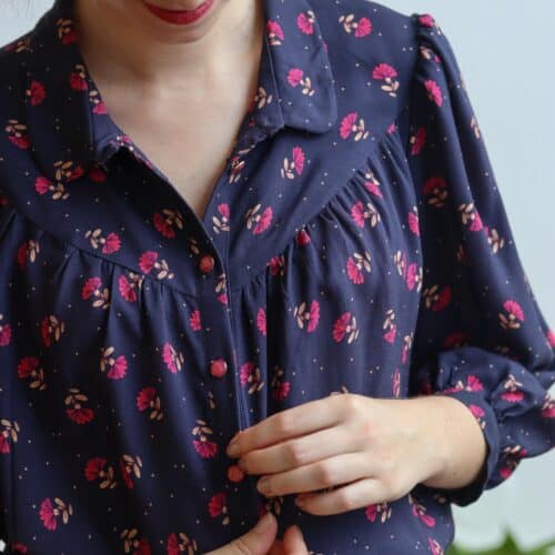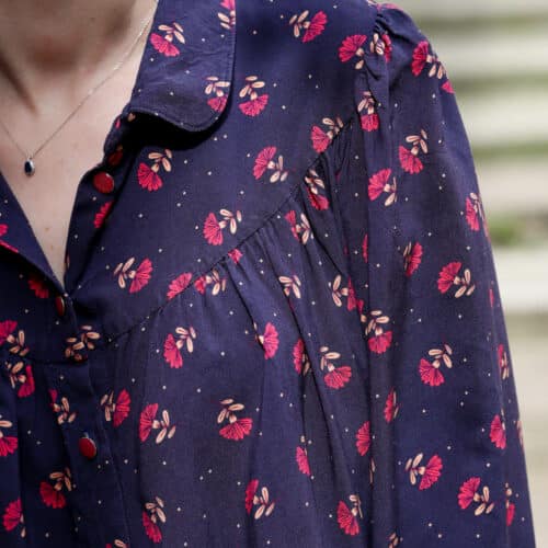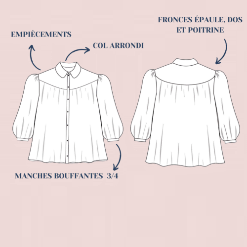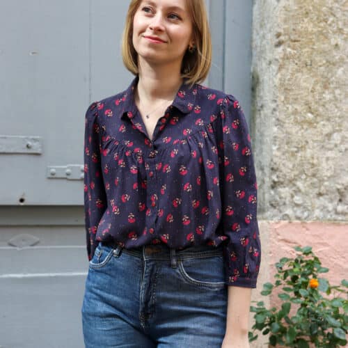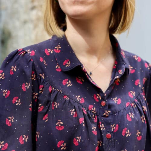 Pimpante is the basic shirt twisted by Lise Tailor. The front and back yokes enhance a pretty play of volume. The gathers are evenly dis- tributed to offer an harmonious figure be the shirt worn inside or outside your jeans or skirt. Puffy sleeves echoe the shirt’s design while unveiling the wrists to bring lightness and feminity. The final touch of this pattern lies in the pretty Peter Pan collar and its curvy finishings.