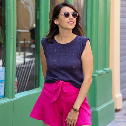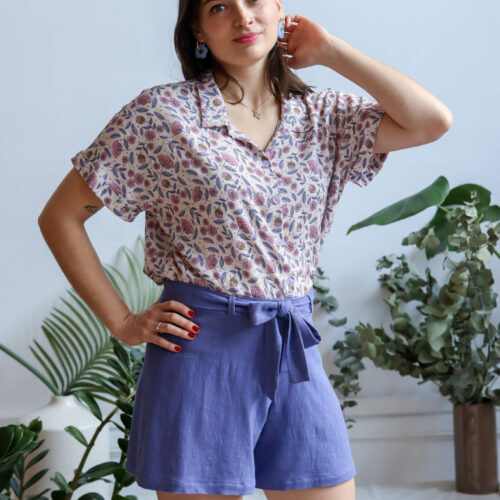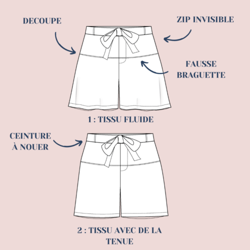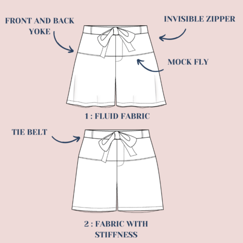 Choose option 1 for a light and flare version of the shorts, perfect for summer with a fluid drape (viscose, linen viscose). But if you want a straight cut suitable to medium and heavyweight fabrics (gabardine, corduroy), then go for option 2.