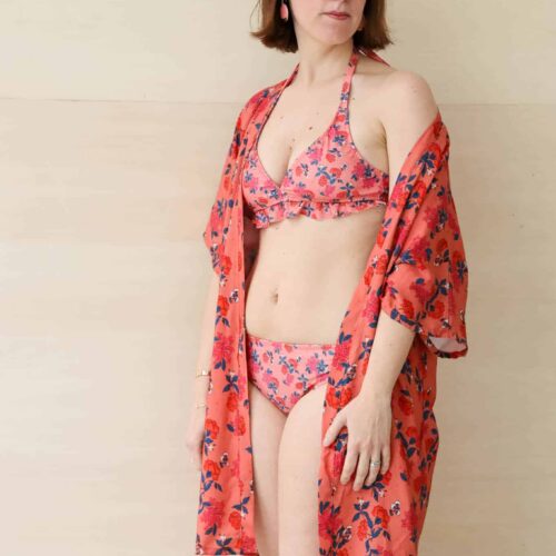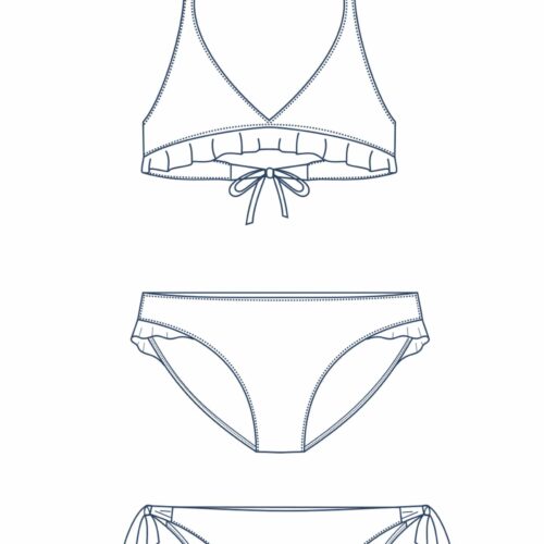 The pattern has been drafted for a lycra smiwsuit with a minimum of 15 % elastane and a swimsuit lining («Mousse Claudia»). The fabric metrage is planned for sewing one top and one bottom (A or B)