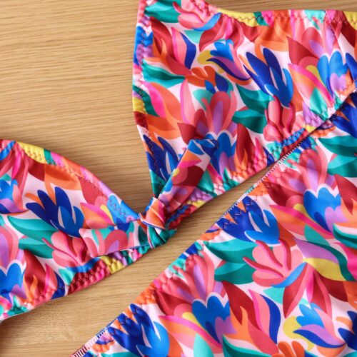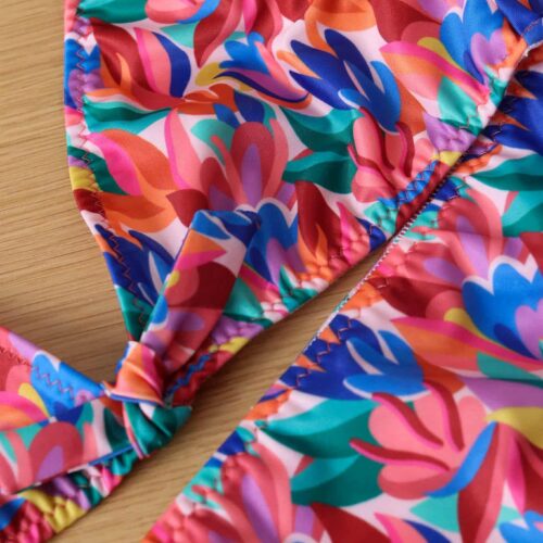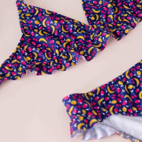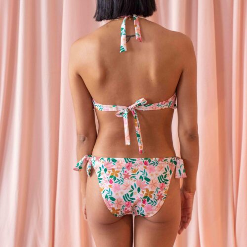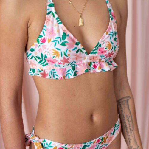 Hello Sunshine, is a pretty bikini swimsuit featuring a triangle shaped top with neck and back ties. The swimsuit bottom offers two options: the first option offers a tied on the hips finish and the second option has a regular waist, that is enhanced by a ruffle making it even more cute!