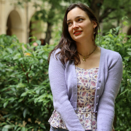 Céline wears the Alma scarf (Merino + Silk Mohair)