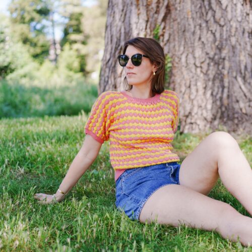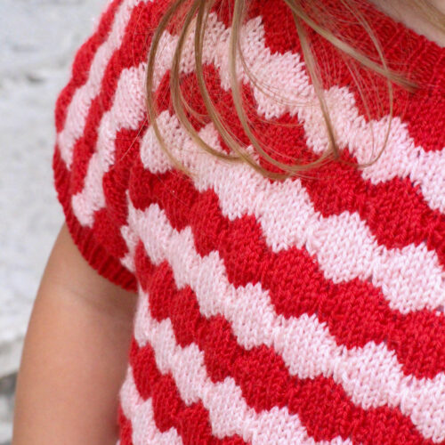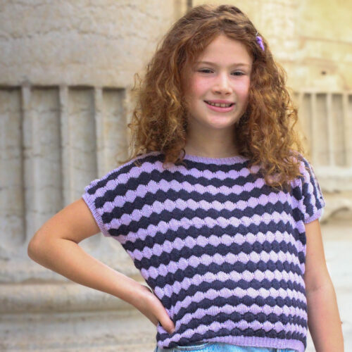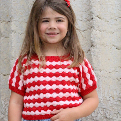 The Mona top is available in both child and adult sizes, making it ideal for matching family outfits. Its charming stitch pattern makes it perfect for knitters of all skill levels, from confident beginners to more experienced knitters.