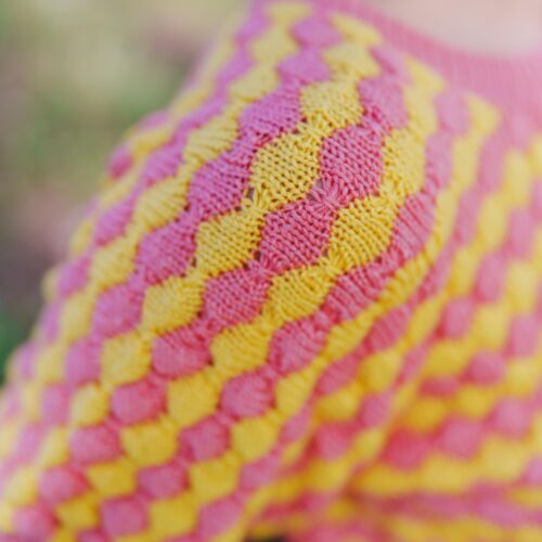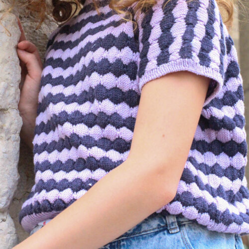 Knitted top-down in a bubble stitch pattern with stripes, Mona is playful and textured. It begins at the shoulders, worked separately and overlapping front and back. These sections are then joined to knit the back, followed by the front. Both are joined under the arms, and the body is then worked in the round.