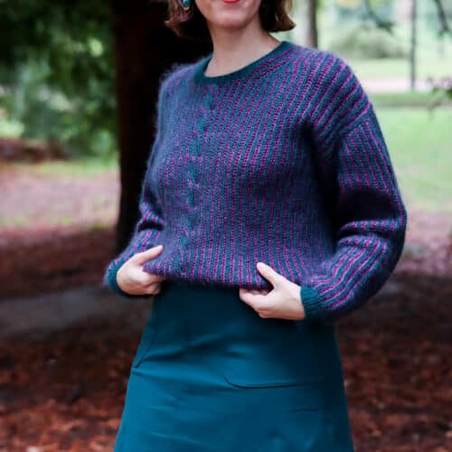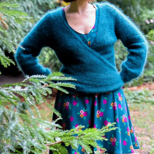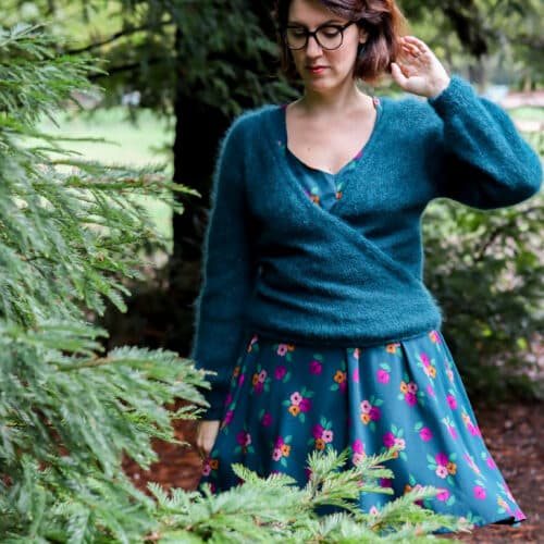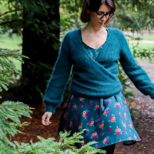 Lise P. wears the sweater Malya by Lise Tailor and the wrap cardigan Naëlle by Lise Tailor