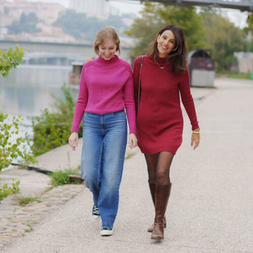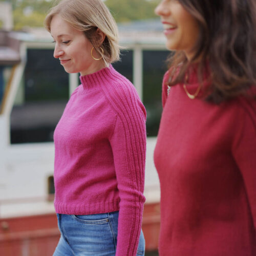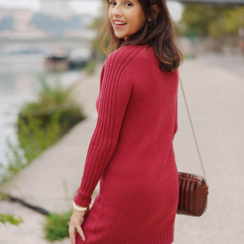 The Stella dress is worked from the top down, featuring elegant saddle sleeves and a beautiful ribbed detail running along the arms. With its mock neck and adjustable length, this is a versatile piece: you can knit it as a mid-thigh dress, a longer version, or even a cosy pullover. It’s a perfect project for adventurous beginners ready to explore new techniques.