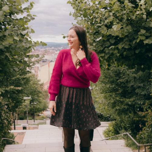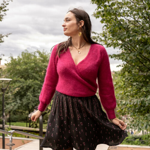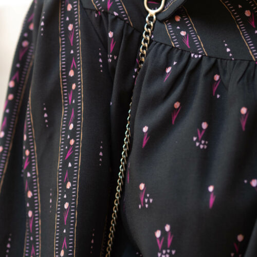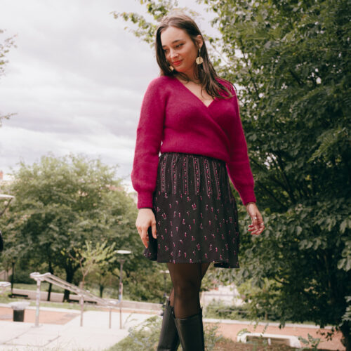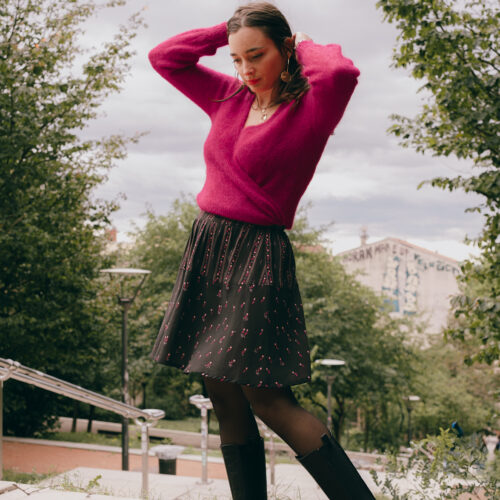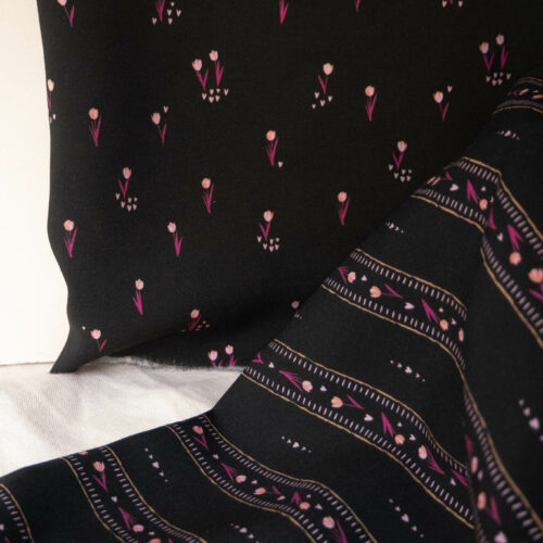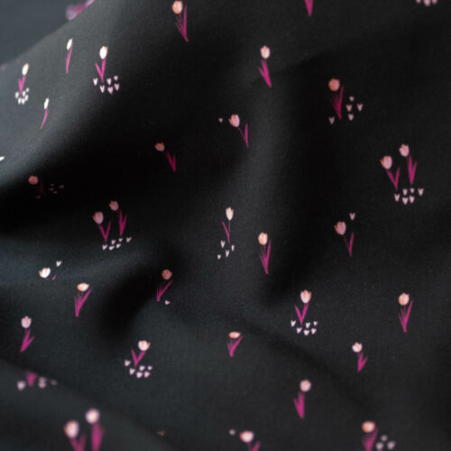Bloom Every Day returns this season with a deeper and more vibrant color palette. Set against a deep black background, which highlights every detail, vibrant fuchsia tulips bloom with life and color. These tulips unfold with elegance, interspersed with small pink hearts, adding a touch of softness and romance, evoking tender and warm feelings. Their color contrasts beautifully with the intensity of the fuchsia and the depth of the black background. Whether as a dress, blouse, or skirt, Bloom Every Day pairs perfectly with a sweater or cardigan in our Super Pink wool to make your outfit stand out. A symbol of comfort and affection, your ensemble will accompany your relaxing evenings or gentle conversations with loved ones.