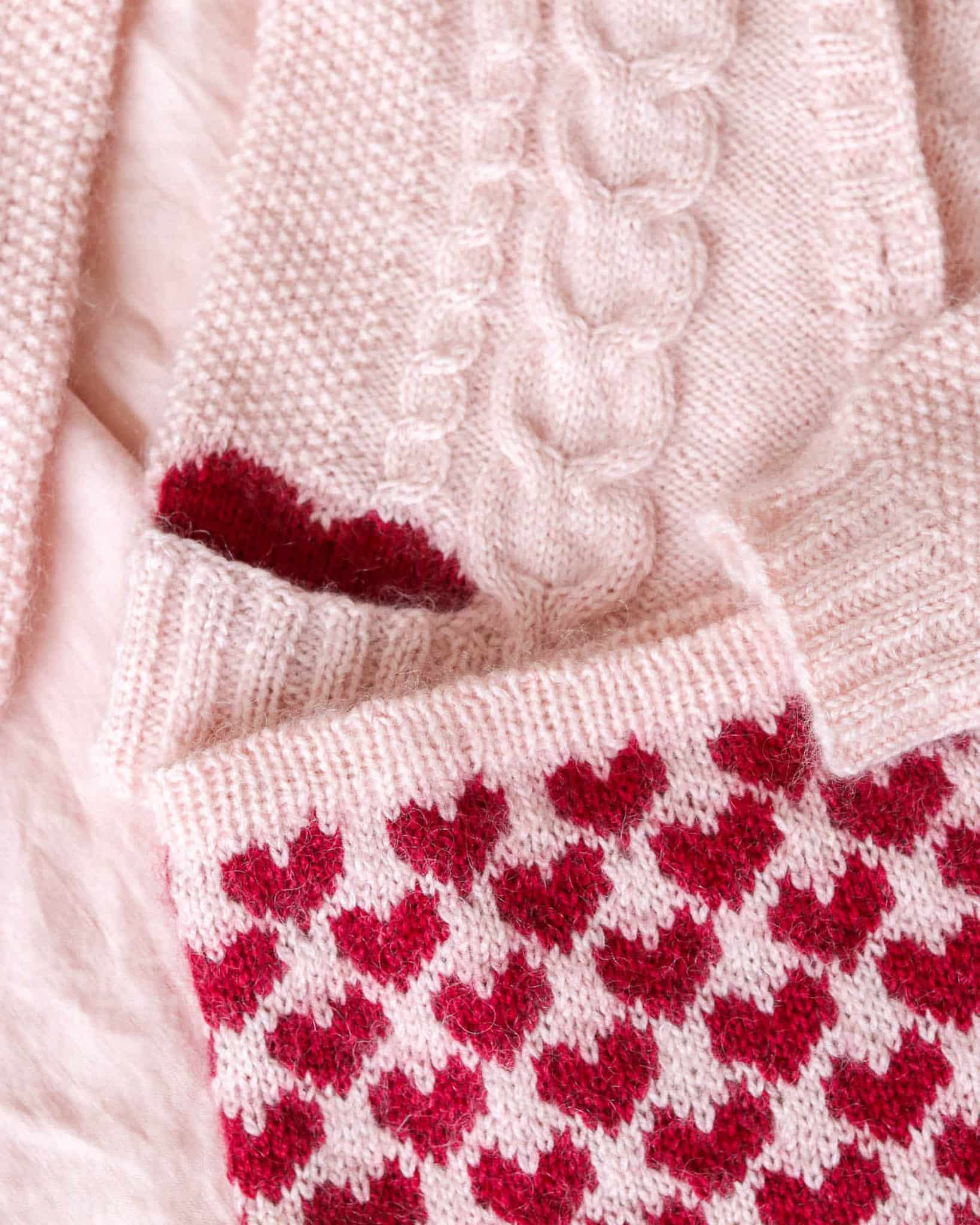 Comme un clin d’oeil à cette période romantique, le gilet Valentine se pare de coeurs : texturé avec la torsade dos, et coloré avec le motif amoureux qui sort de la poche.