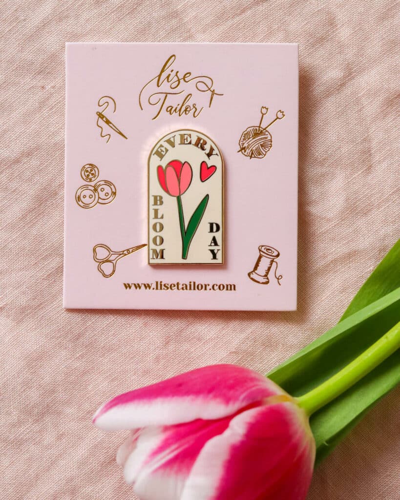 Ce pin’s délicat au motif de tulipes reprend le design de nos viscose Bloom Everyday. Son pourtour doré apporte une vraie touche « bijou » à votre look.