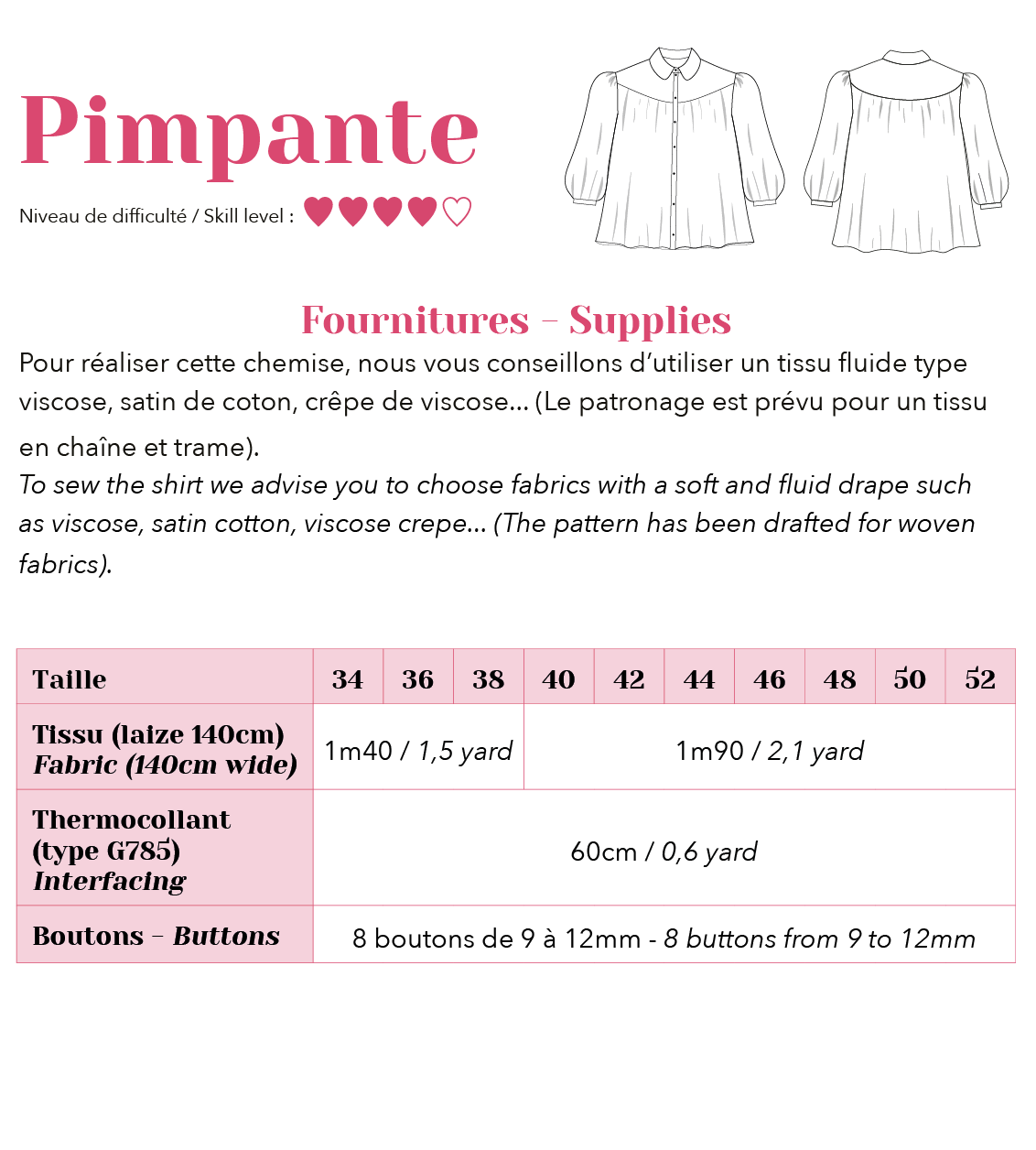 Pimpante est la chemise classique revisitée par Lise Tailor. Les empiècements sur le devant et le dos mettent en valeur le joli jeu de volumes. Les fronces sont réparties de manière harmonieuse pour équilibrer la silhouette afin de porter la chemise sur un jean ou à l’intérieur d’une jupe. Les manches ¾, légèrement bouffantes laissent apparaître les poignets pour apporter féminité et légèreté.
