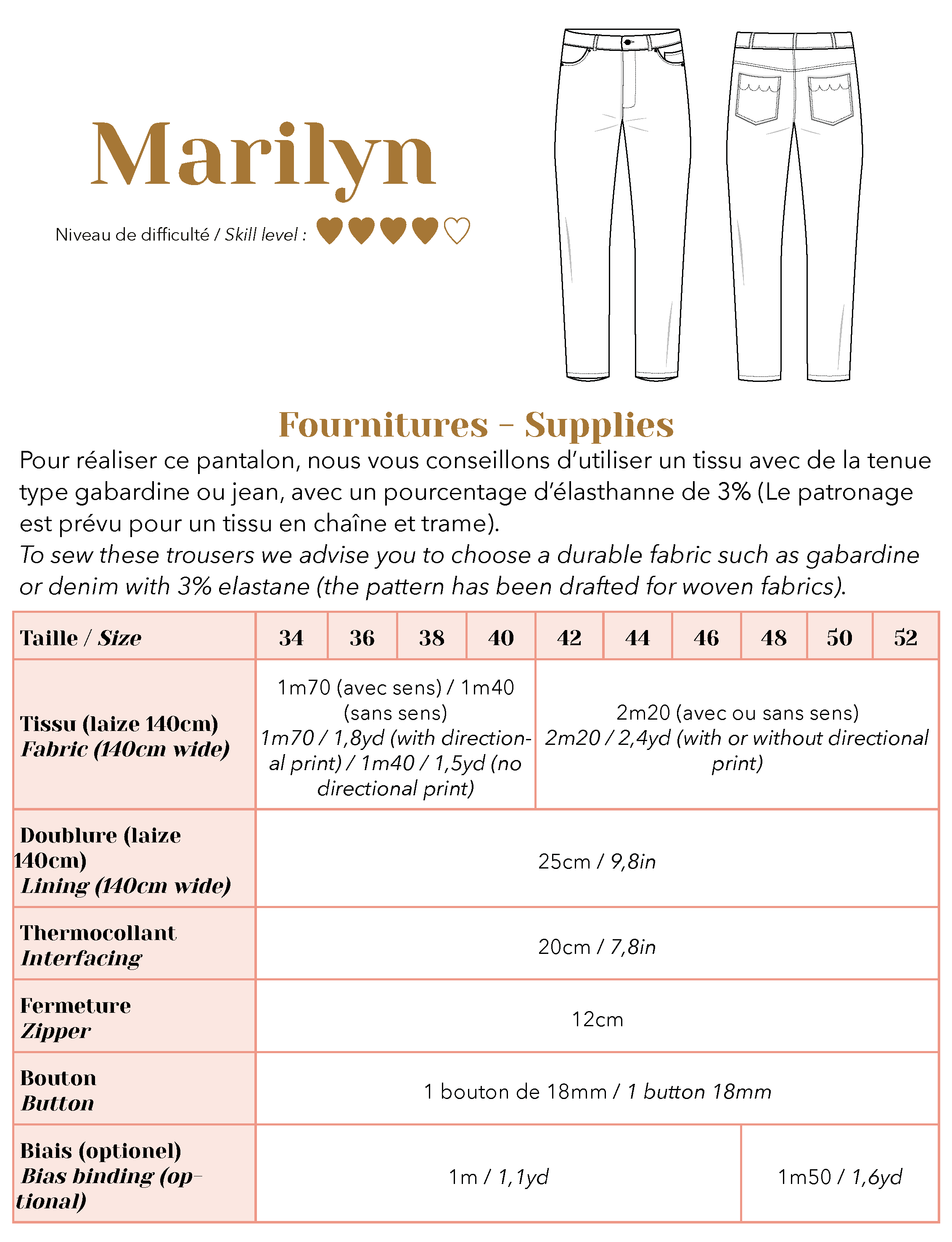 Taille haute et coupe droite, Marilyn deviendra vite la pièce indémodable à coudre dans votre garde robe. A confectionner dans un jean ou une gabardine, vous serez accompagnée dans la réalisation de chaque détail allant de la braguette aux surpiqûres festionnées sur les poches arrières.