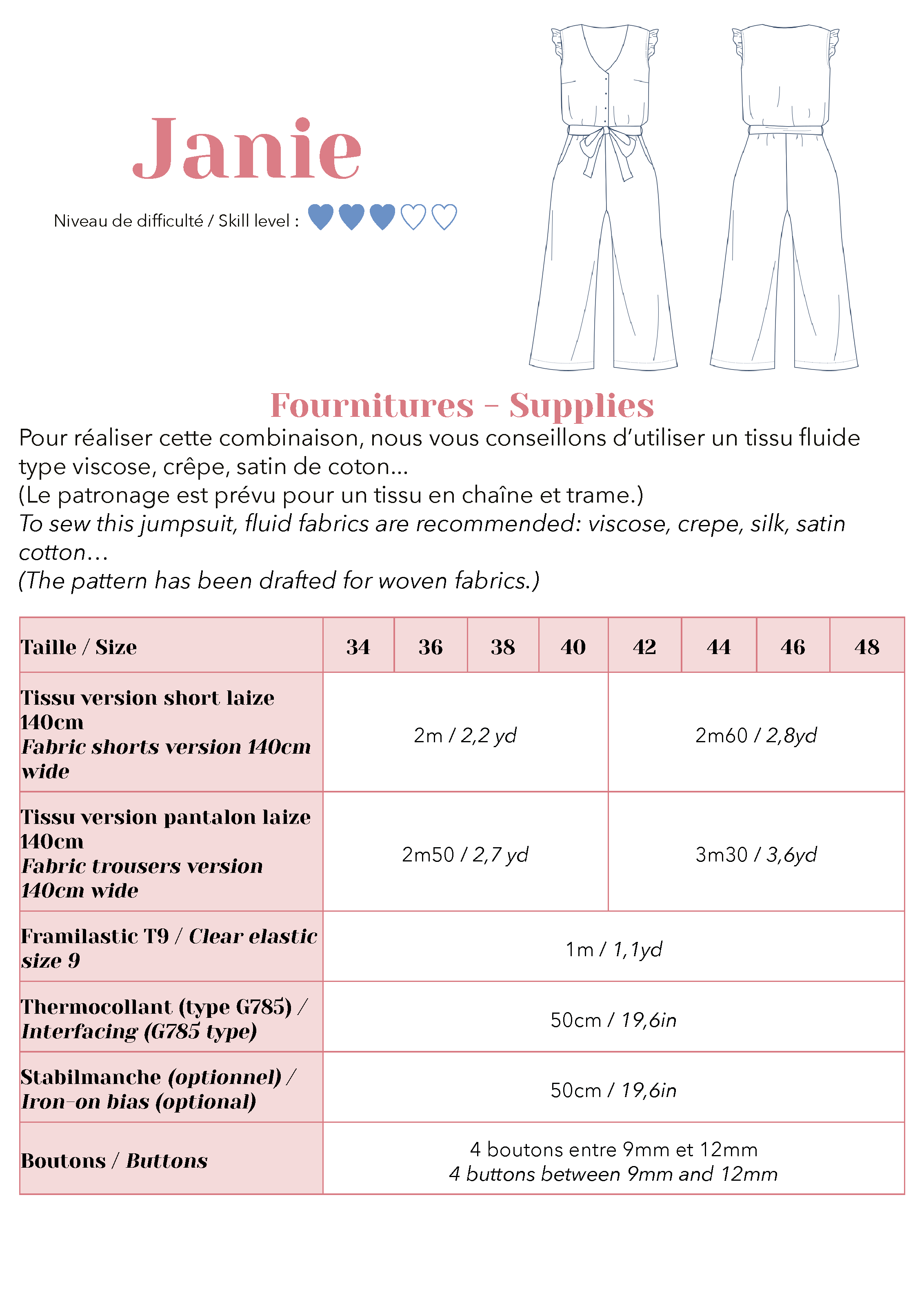 Janie est une combinaison actuelle, féminine et confortable déclinable en short ou pantalon, avec une taille élastiquée et 3 options de manches : mancherons, manches courtes ou manches volantées. Elle s’enfile aisément par le bas grâce à sa jolie encolure en V et son milieu devant boutonné. La version pantalon a une longueur 7/8ème pour mettre en valeur de jolies espadrilles à talons. Sa jambe évasée assure une allure confortable et moderne.
