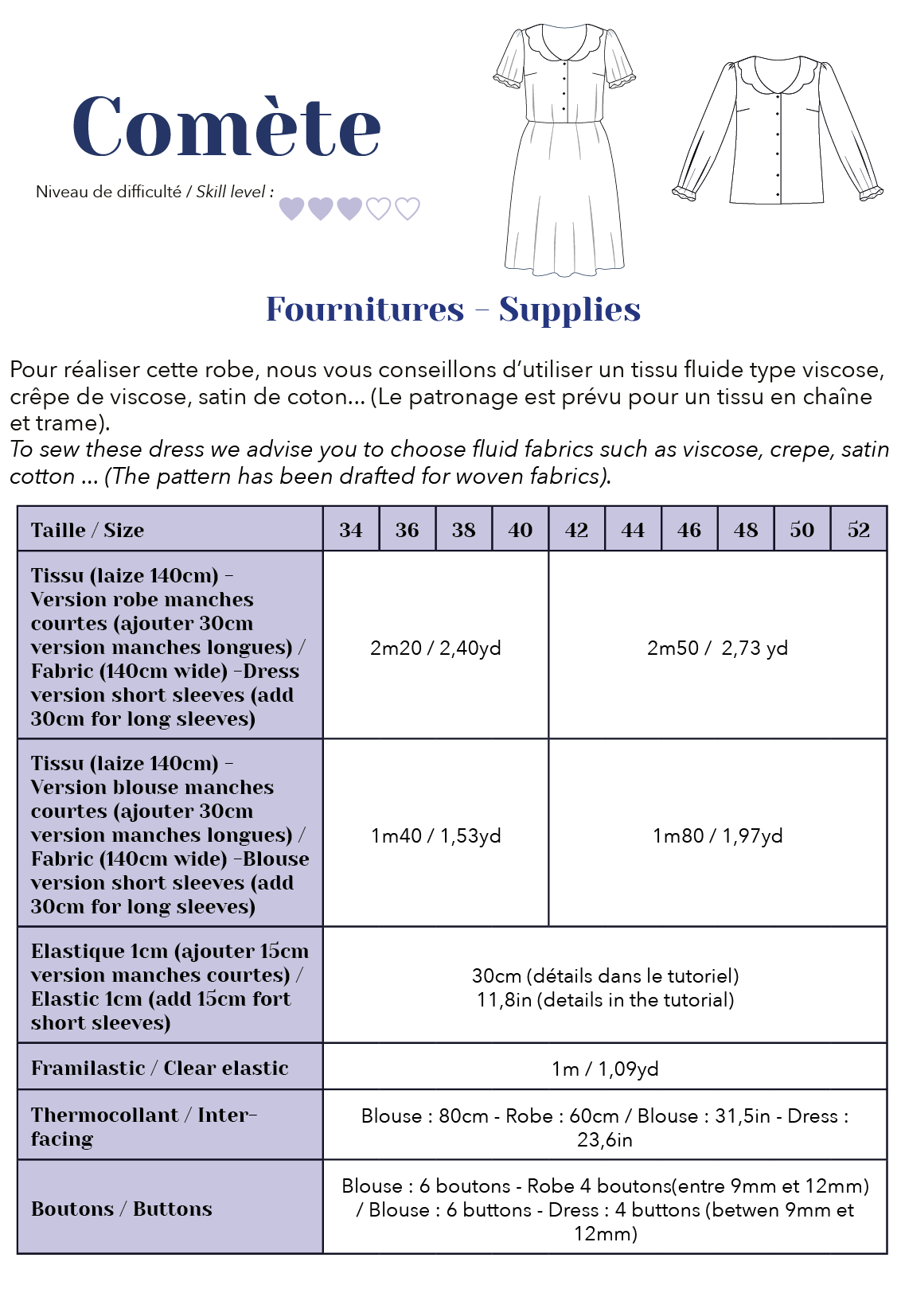 Une robe délicate et raffinée. Boutonnée devant, élastiquée à la taille et dotée d’un col festonné, le patron propose 2 versions de manches ainsi qu’une version blouse.