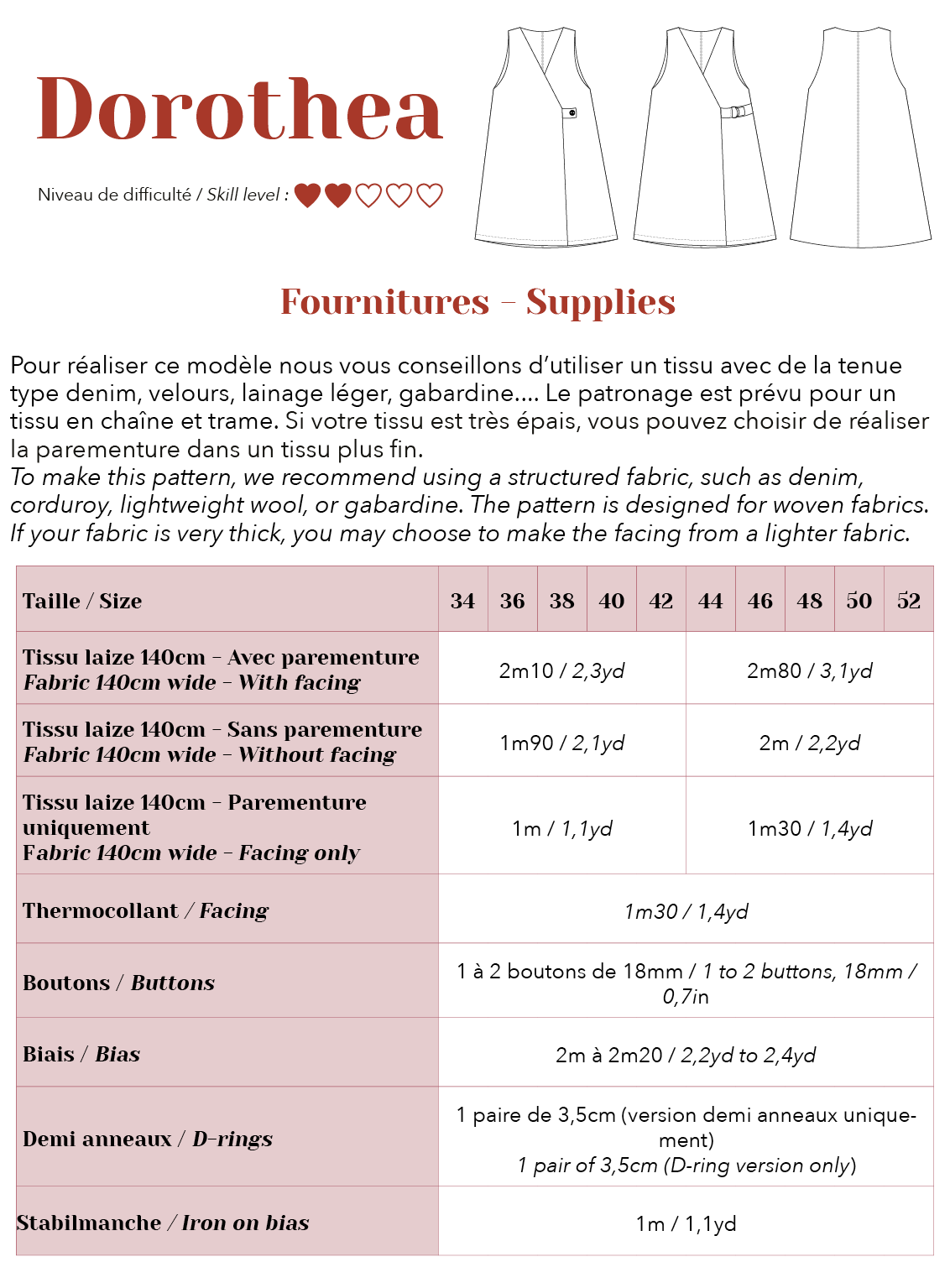Nous attirons votre attention sur le fait que certains patrons, sortis au début de l’aventure Lise Tailor, s’arrêtent à la taille 48. Cette information est clairement précisée sur les fiches produits concernées.
