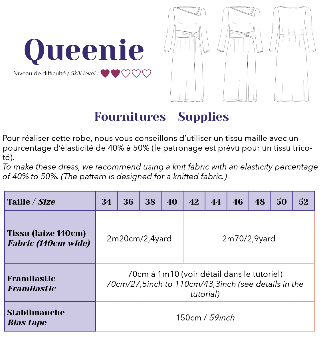 - Une planche à taille réelle du 34 au 52 (sans superposition de pièces - marges de coutures incluses)