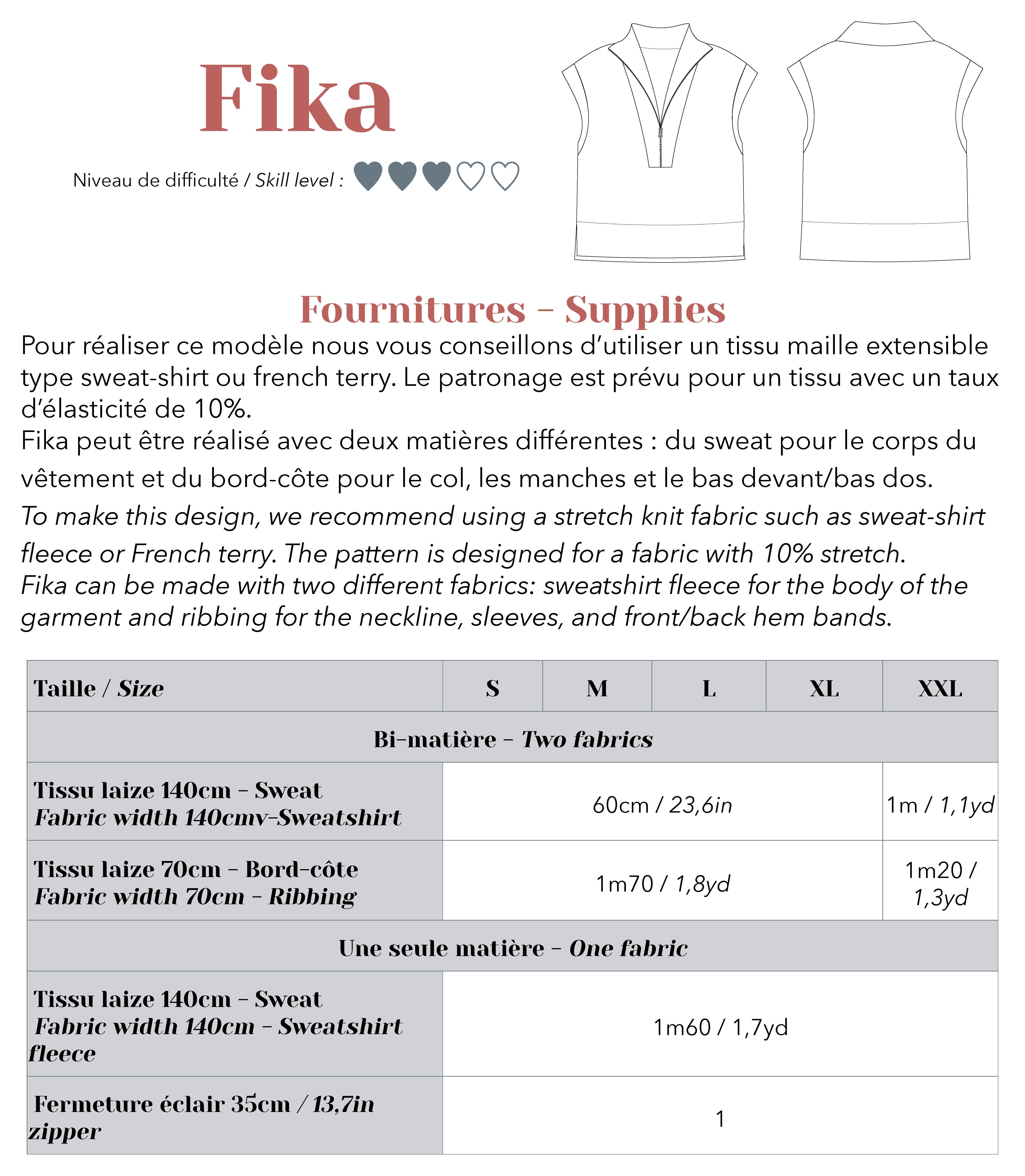 • Une planche à taille réelle (sans superposition de pièces - marges de coutures incluses) du S au XXL