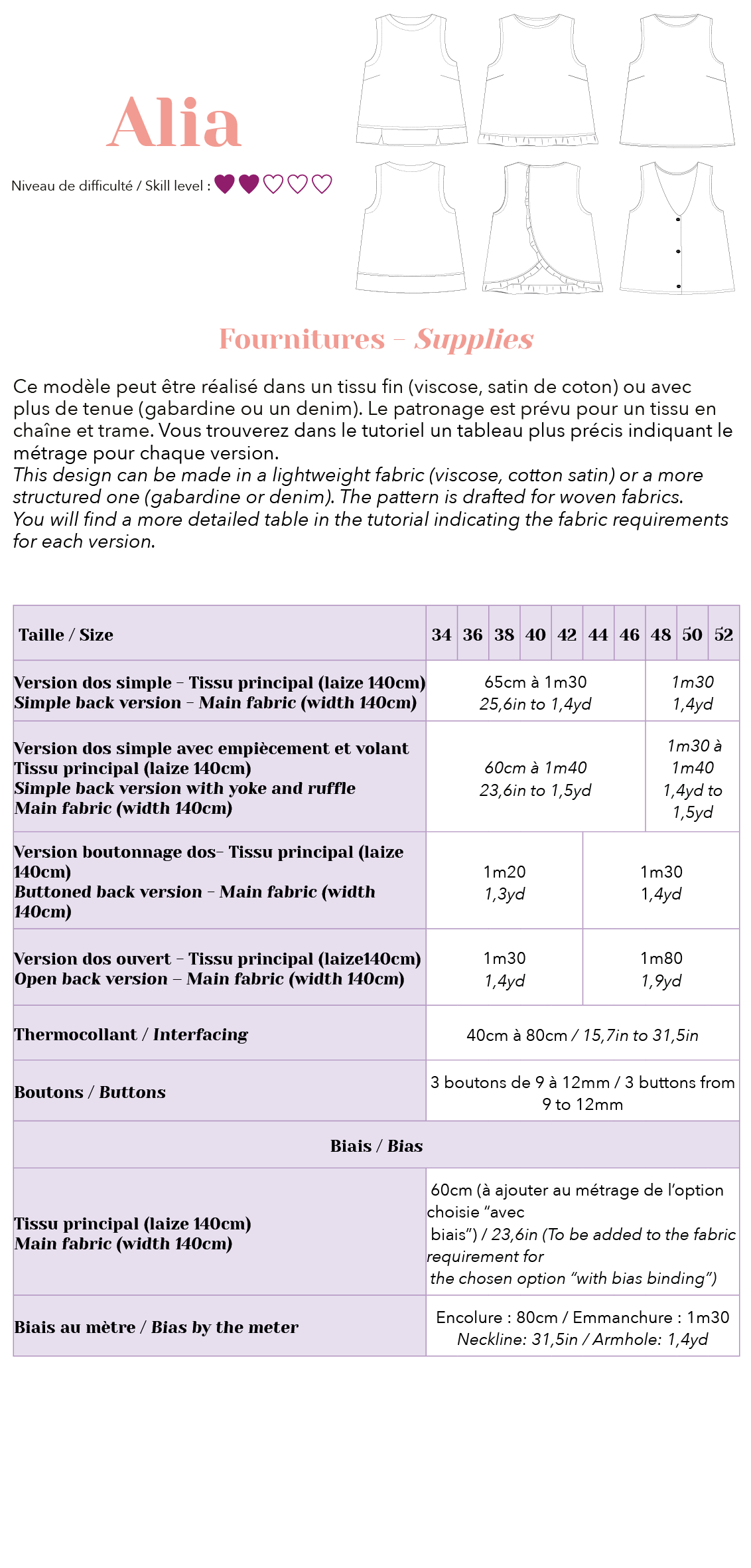 Versatile et féminin, Alia est un top sans manches qui s’adapte à toutes vos envies grâce à ses nombreuses variations ! Selon votre style, optez pour un dos boutonné avec un décolleté en V, une version simple et épurée, ou un dos ouvert pour une touche de légèreté. Le bas peut être structuré avec un empiècement ou sublimé par un volant. Il se prête aussi bien à une matière fluide pour un rendu aérien qu’à un tissu avec de la tenue pour une silhouette plus affirmée. Un essentiel à décliner au gré de vos inspirations !