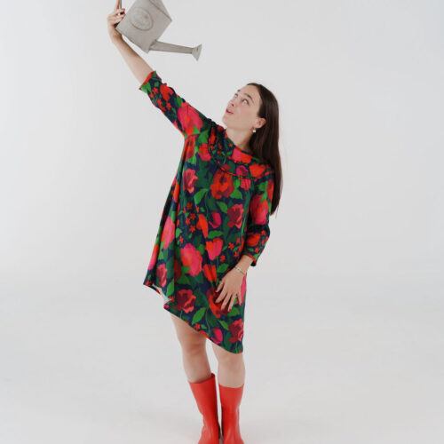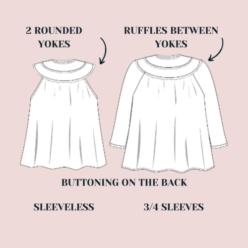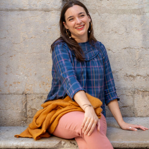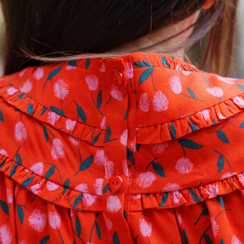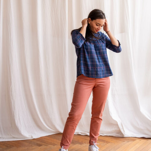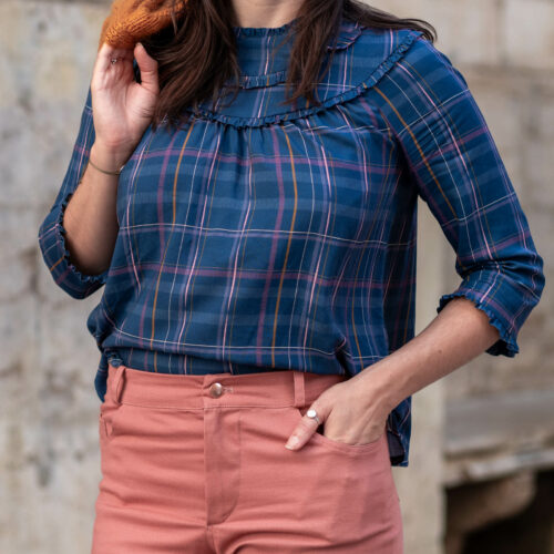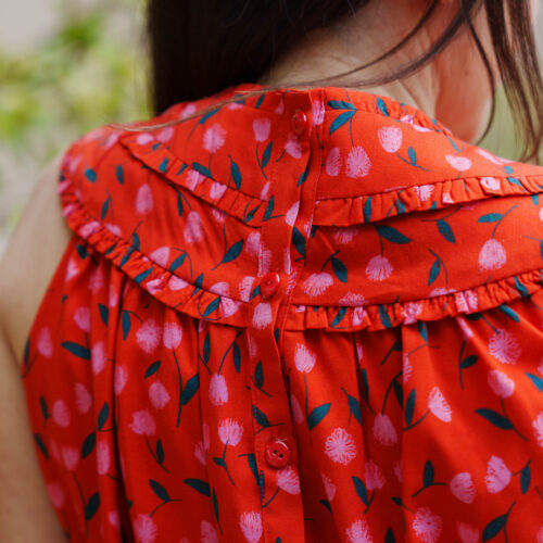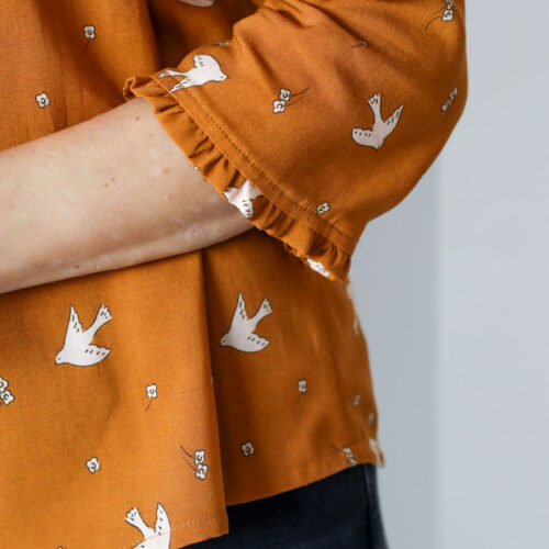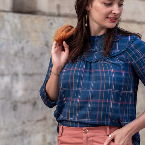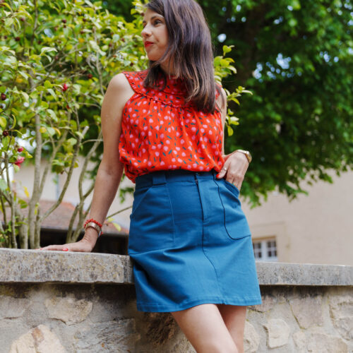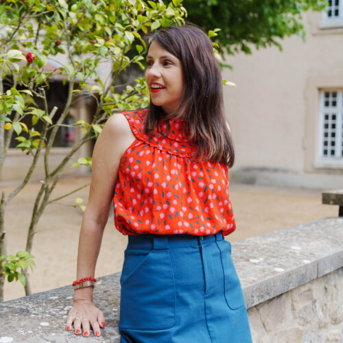 Délicate est un modèle à porter en version blouse avec des manches 3/4 ou en version top sans manches. Avec deux empiècements arrondis posés comme un plastron sur le haut du buste devant et dos, cette blouse vous permet de jouer avec les matières et les imprimés. Des volants entre les empiècements, à l’encolure et au bas des manches habillent cette pièce à la coupe légère boutonnée dans le dos.