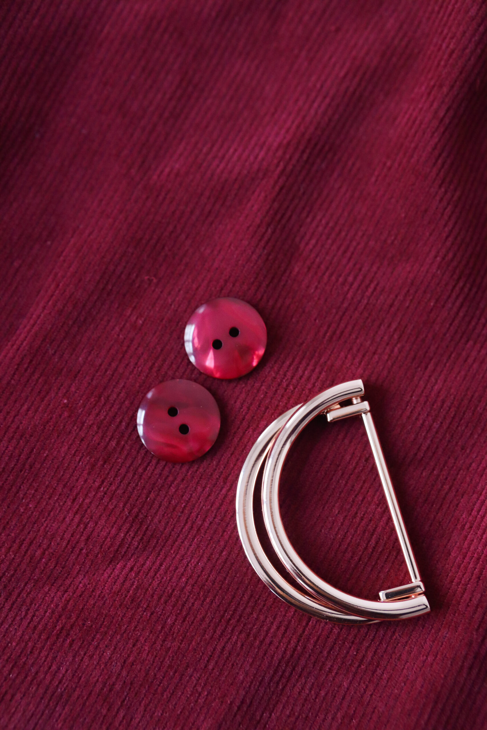 – La mercerie nécéssaire : 1m Stabilmanche noir + 2 boutons sparkle noir (pour le velours noir et vert) ou bordeaux (pour le velours bordeaux) + 1 paire de demi-anneaux or rose