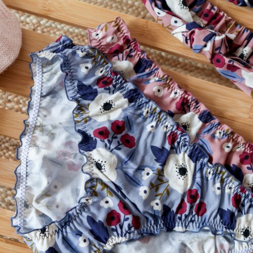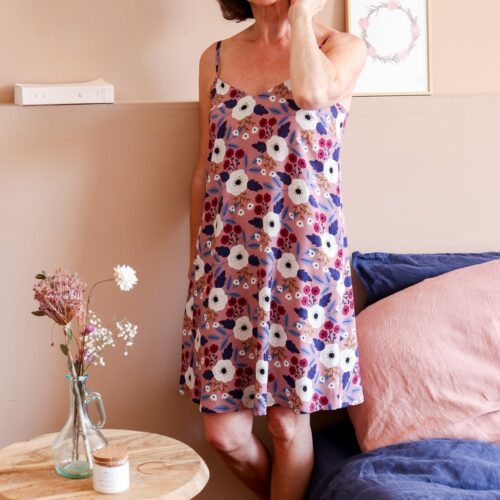 C’est naturellement à notre patron de nuisette que nous l’associons. Il s’agit d’une pièce délicate qui se prête à la perfection à ce tissu. Nous avons voulu notre nuisette confortable et un brin sexy avec son décolleté en V. Une adorable culotte froufrou complète cet ensemble, elle est aussi mignonne que confortable !
