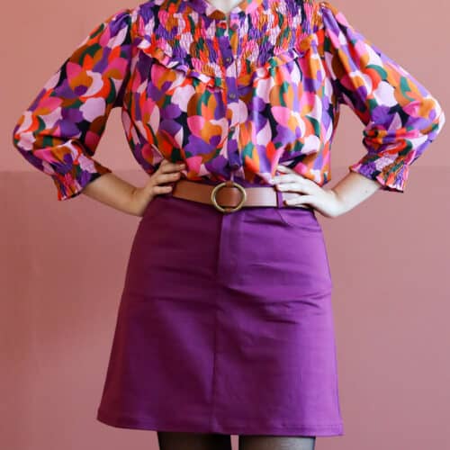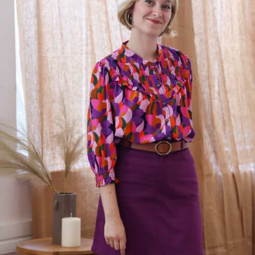 – Tous les boutons coloris violet marieront à merveille avec ce tissu