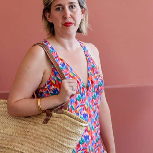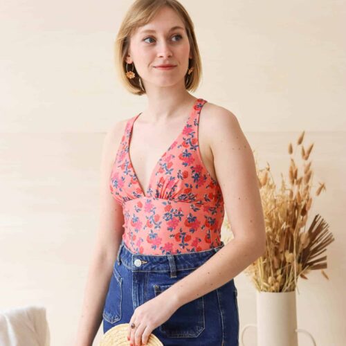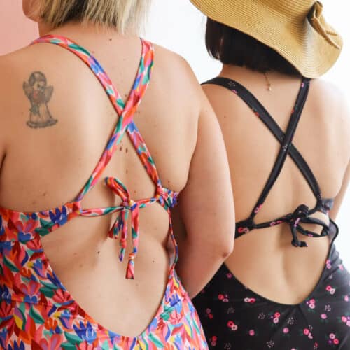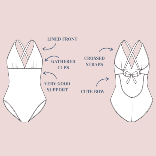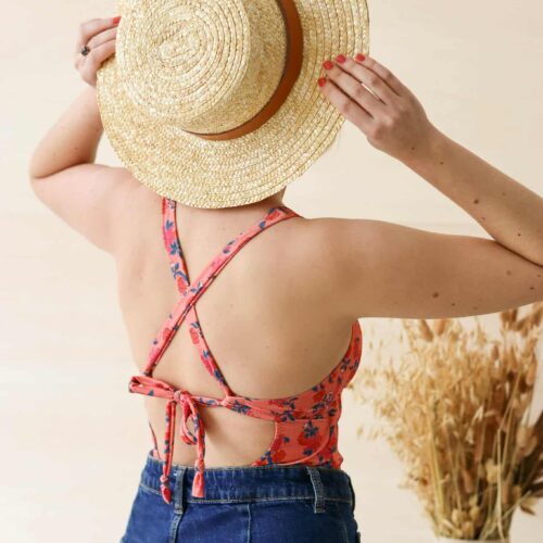 L’échancrure dans le dos est mise en valeur grâce au jeu de croisement des bretelles. Ces liens sont pensés pour s’adapter à différentes morphologies et permettre un ajustement optimal lors de l’essayage (sans ajustement couture particulier). Les bretelles ont pour vocation à se porter croisé dans le dos mais la version sans croisement est possible pour varier les styles et le bronzage.