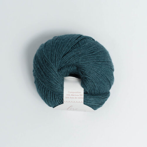 Pelote de laine exclusive Lise Tailor. Le fil de mérinos & soie est respirant et léger et se prête parfaitement à des projets estivaux à porter à même la peau au printemps et en été.