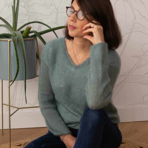 Céline porte le Cumulus Blouse de PetiteKnit.
