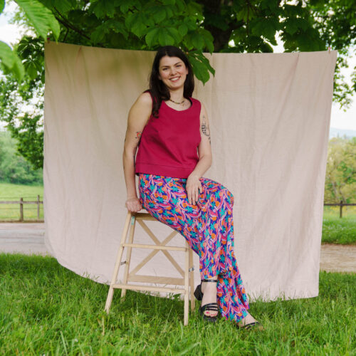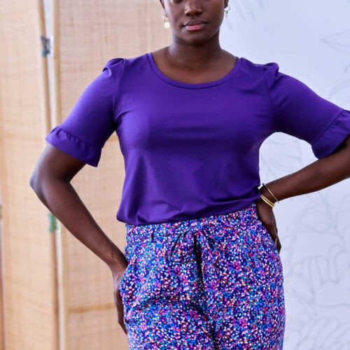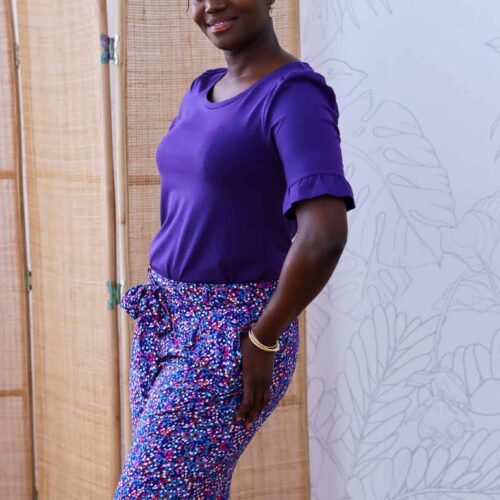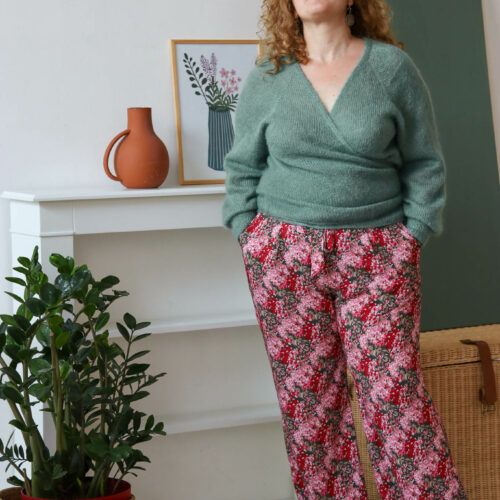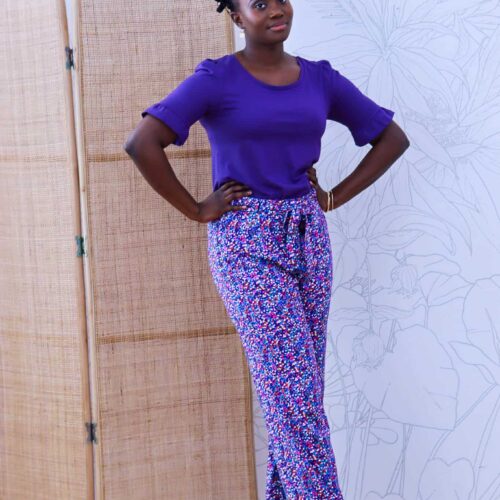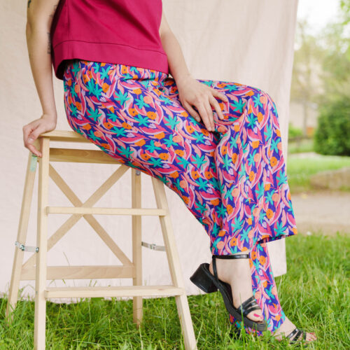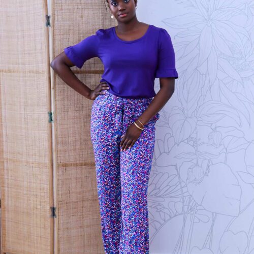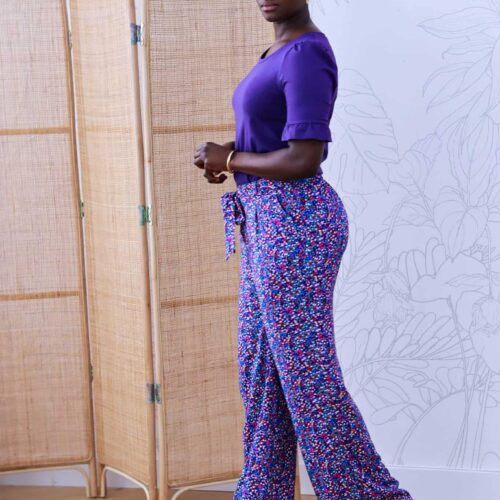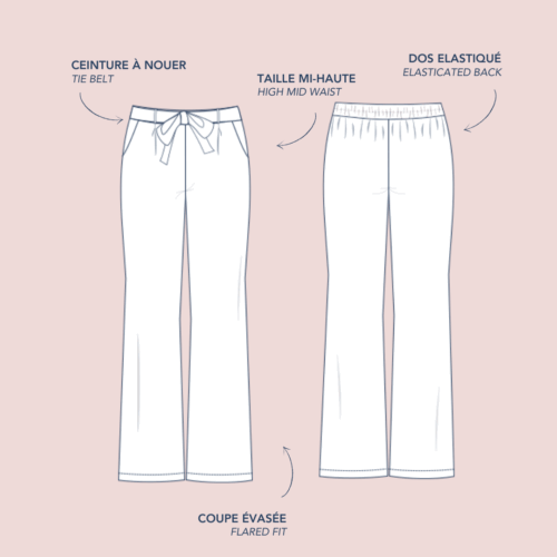 Giverny est un pantalon taille haute fluide et élégant à porter pendant les beaux jours. Sa coupe est légèrement ajustée au niveau des cuisses et évasée sur le bas. La taille est mise en valeur avec une ceinture à nouer qui se glisse dans des passants. Seul le dos est élastiqué et les plis sur le devant donnent l’aisance nécessaire pour un pantalon confortable.