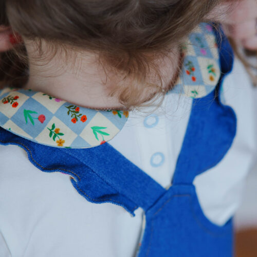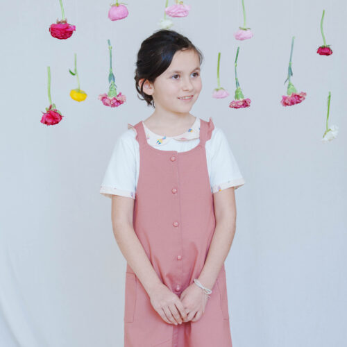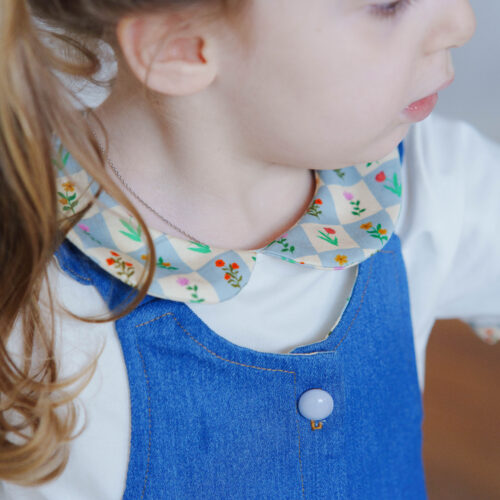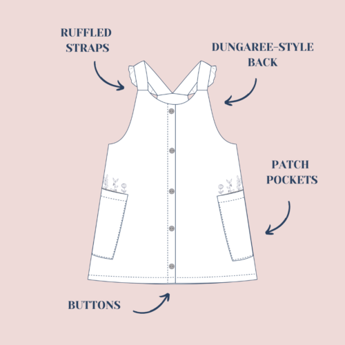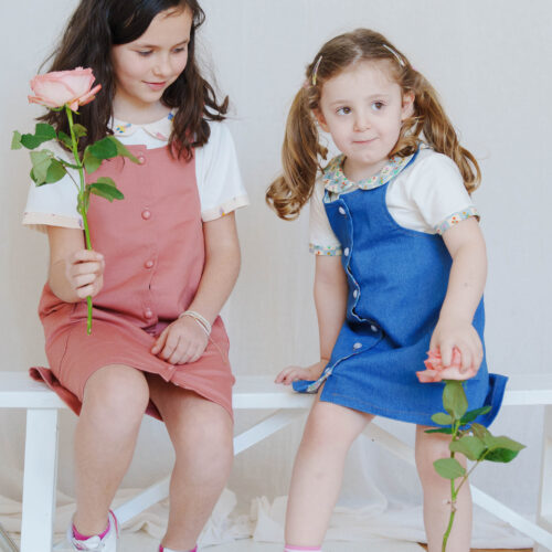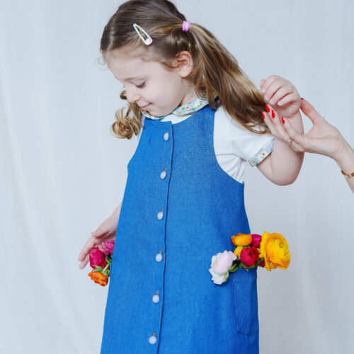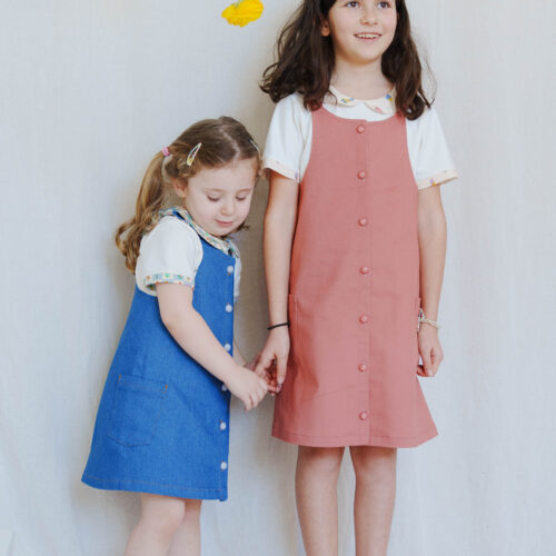 Pixie, parfaite en gabardine, denim ou tout tissu structuré, déborde de charme ! Ses bretelles peuvent être ornées de volants délicats pour une touche élégante, tandis que son dos façon salopette ajoute une note ludique. Les poches plaquées, astucieusement placées de part et d’autre des coutures latérales, n’attendant qu’à être brodées pour un fini unique et personnalisé. Facile à réaliser grâce à sa parementure finie au biais, cette robe accompagnera les petites modeuses dans toutes leurs aventures.