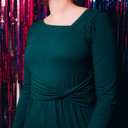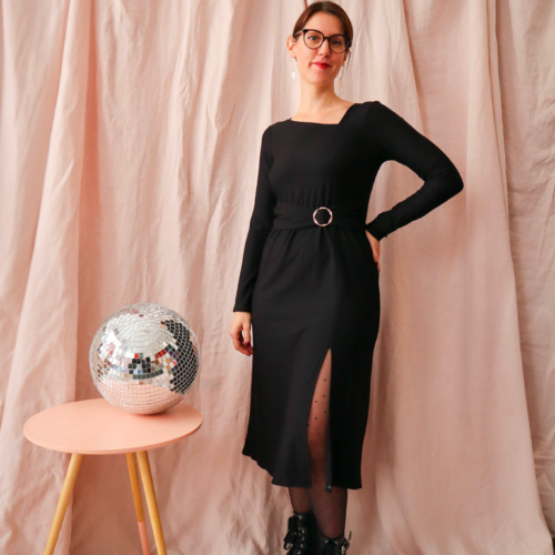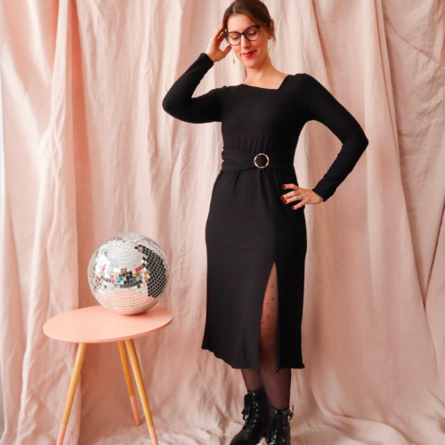 Pour réaliser cette robe, nous vous conseillons d’utiliser un tissu maille avec un pourcentage d’élasticité de 40% à 50%. (Le patronage est prévu pour un tissu tricoté).