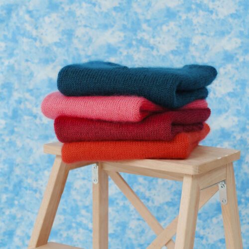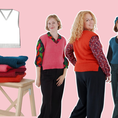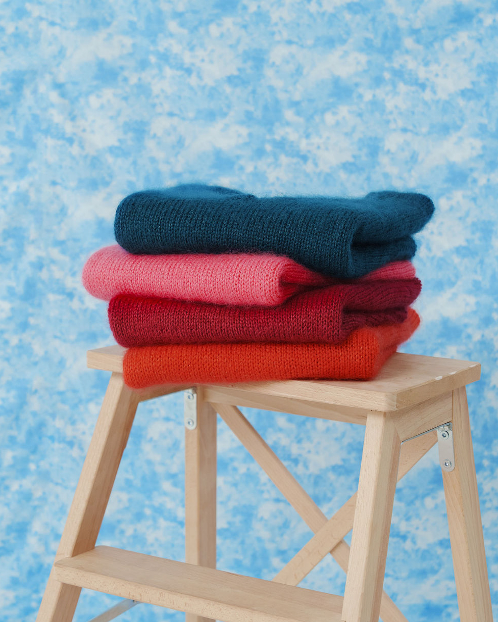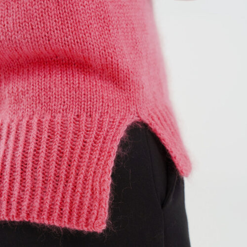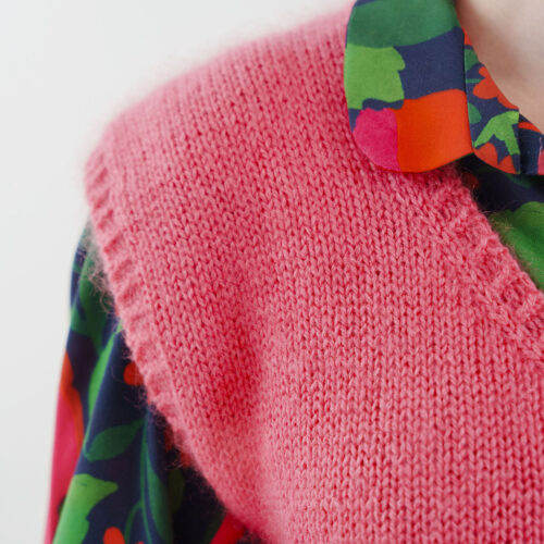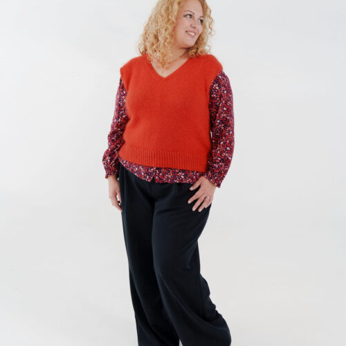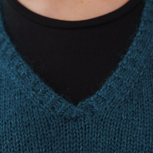 Gaby se tricote d’une seule pièce, en top-down, sans couture. On commence par le dos, travaillé à plat jusqu’aux emmanchures. Les mailles des épaules sont ensuite relevées pour former le devant et construire l’encolure en V. Le corps est rejoint en rond sous les bras, puis tricoté en une seule pièce jusqu’à la bordure. Les finitions en côtes 1/1 demi-torse soulignent les lignes épurées du modèle.