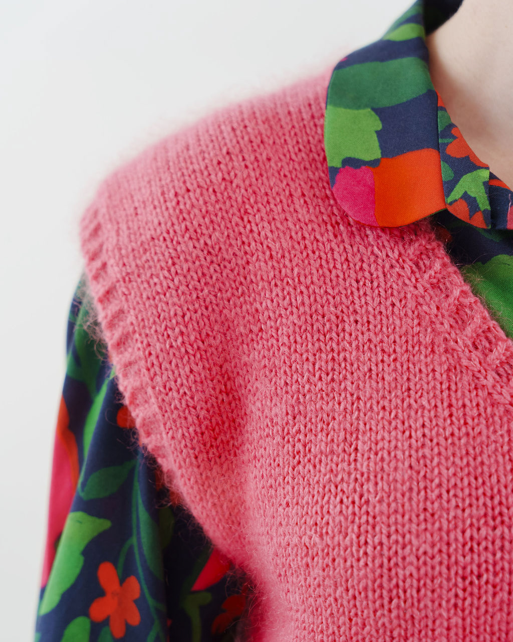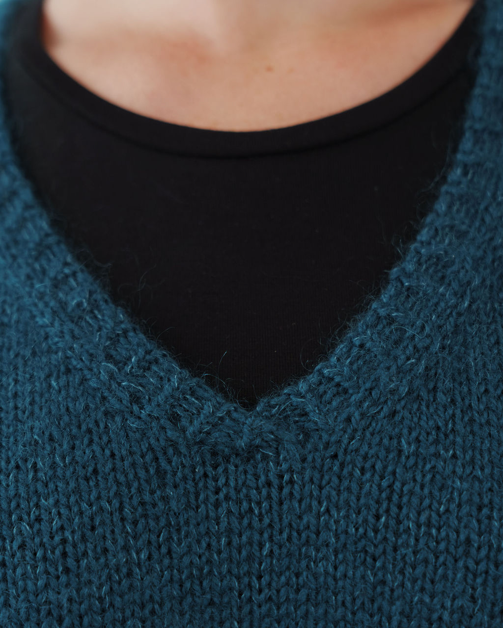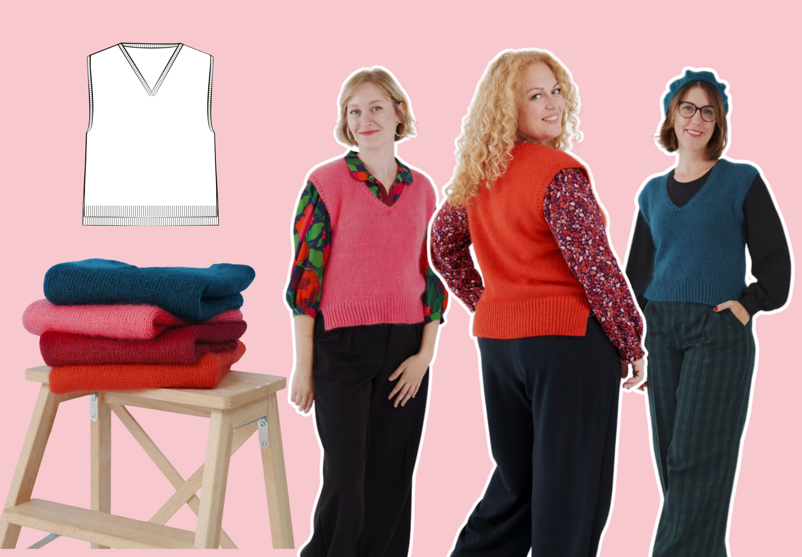 Gaby se tricote d’une seule pièce, en top-down, sans couture. On commence par le dos, travaillé à plat jusqu’aux emmanchures. Les mailles des épaules sont ensuite relevées pour former le devant et construire l’encolure en V. Le corps est rejoint en rond sous les bras, puis tricoté en une seule pièce jusqu’à la bordure. Les finitions en côtes 1/1 demi-torse soulignent les lignes épurées du modèle.