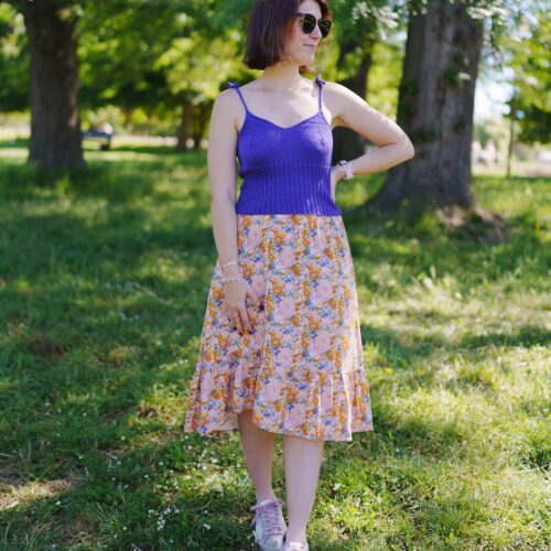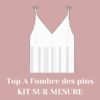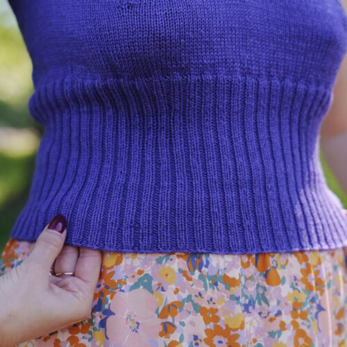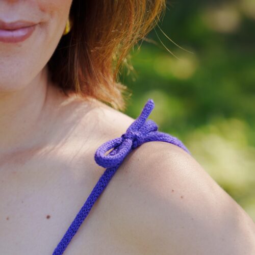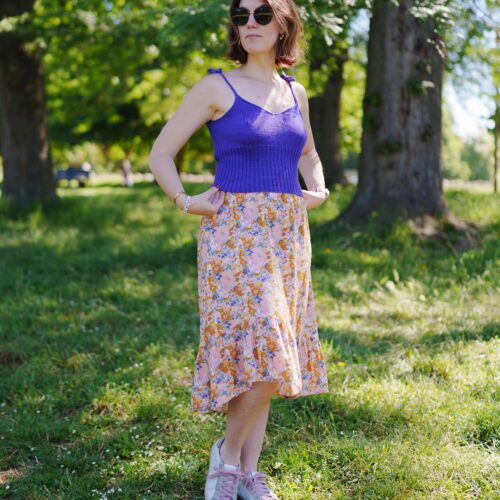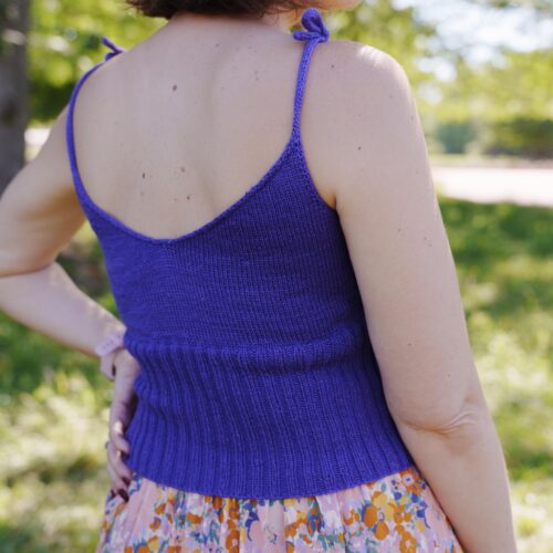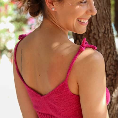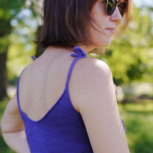 Le top «À l’ombre des pins» est un modèle très simple et rapide à réaliser. Il se tricote du bas vers le haut. Le corps est réalisé en côtes 2/2 en circulaire. La poitrine est mise en valeur par des augmentations, puis le devant et le dos sont travaillés séparément en allers-retours. Les bretelles sont tricotées en i-cord pour être ensuite nouées sur l’épaule.